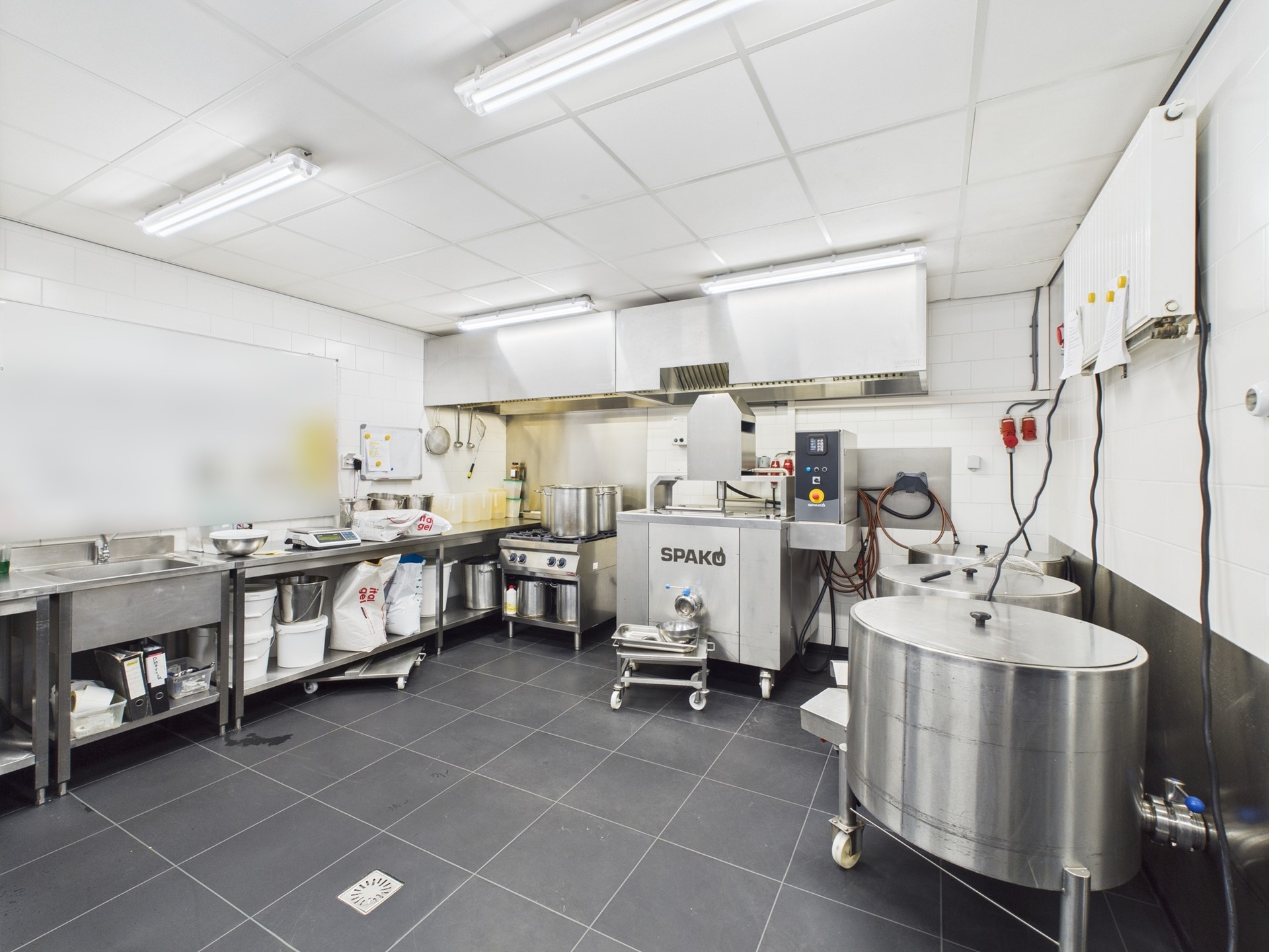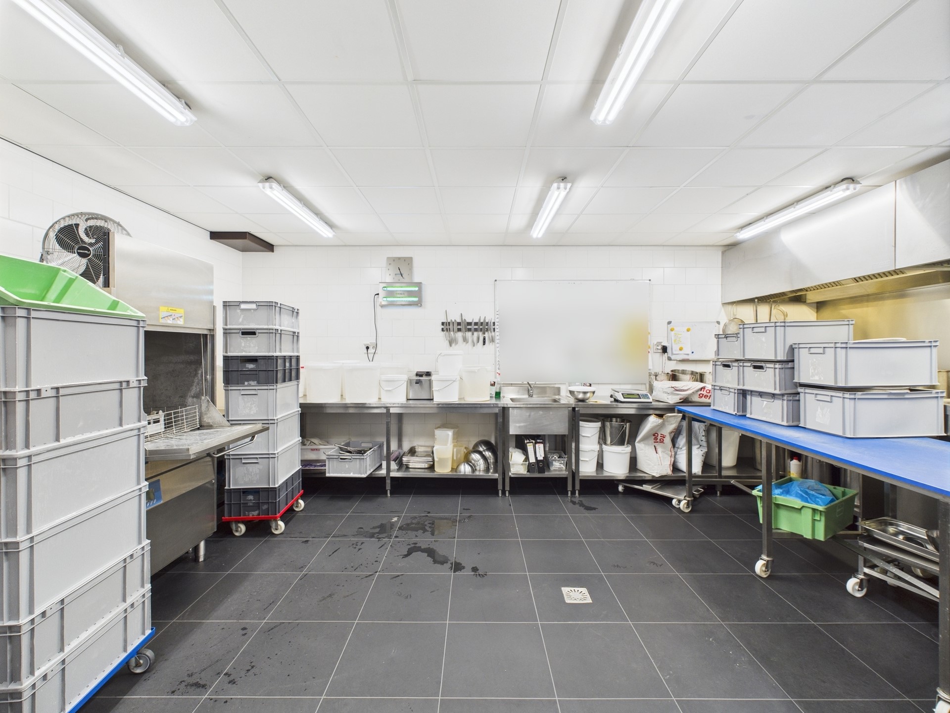 De unit beschikt over een professionele keuken, ideaal voor de bereiding van verse producten. De keuken is uitgerust met een dubbele spoelbak met kraan, vaatwasmachine, waterontharder, meubel met enkele spoelbak, twee x 4-pits gasfornuis, drie roestvrijstalen werkbanken, twee shockkoelcellen (deze kunnen omgebouwd worden tot vriezer) en een afzuigkap.