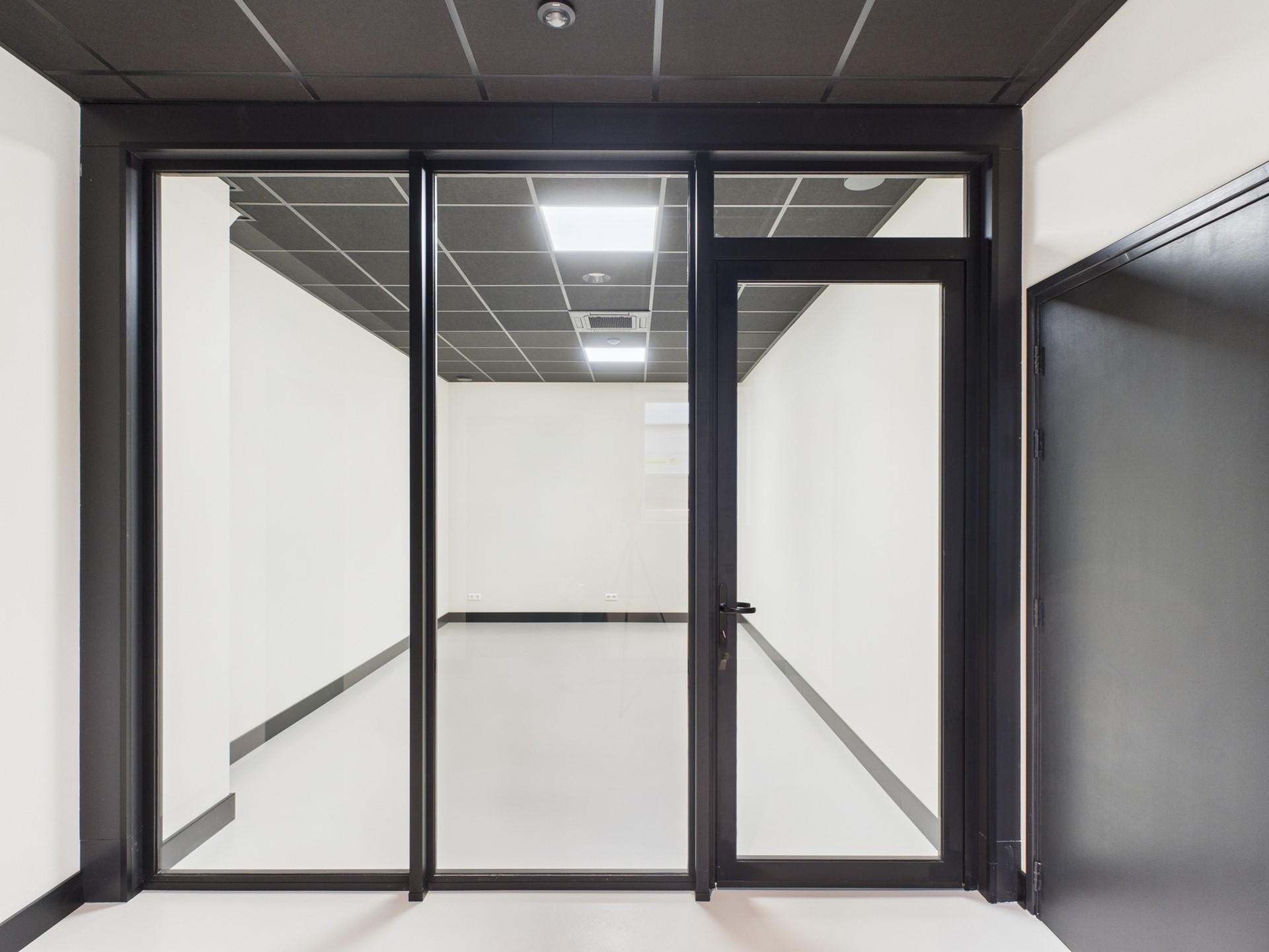 De ingang bevindt zich aan de zijkant van het gebouw en is direct bereikbaar vanaf het ruime parkeerterrein — ideaal voor zowel medewerkers als bezoekers. Via deze entree loopt u de verzorgde ontvangstruimte binnen, waaraan direct een kantoorruimte grenst die zich uitstekend leent als receptie of frontoffice.