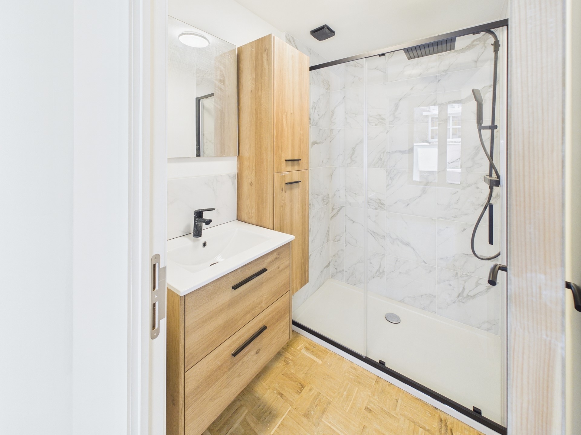 Inkomhal met toegang tot de woonkamer en keuken. De nieuwe keuken beschikt over alle benodigde inbouwapparatuur; een elektrische kookplaat, afzuigkap, oven en vaatwasser. Naast de keuken vind je een aparte toiletruimte en het cv-hok met hierin de aansluiting voor de wasmachine. Aan de voorzijde van het gebouw bevindt zich de slaapkamer met aansluitend de badkamer. De badkamer is volledig vernieuwd en beschikt over een inloopdouche en wastafel met meubel.