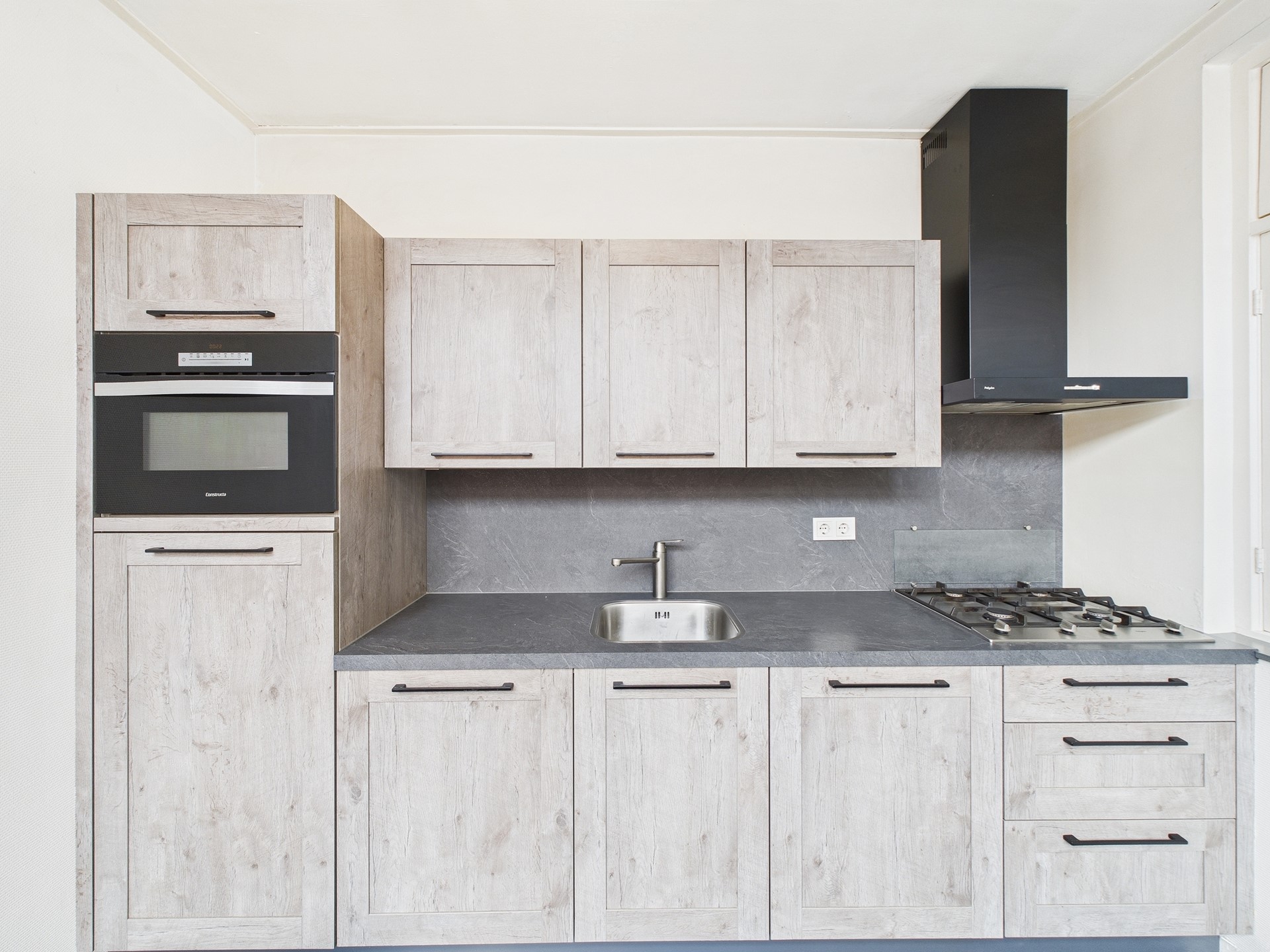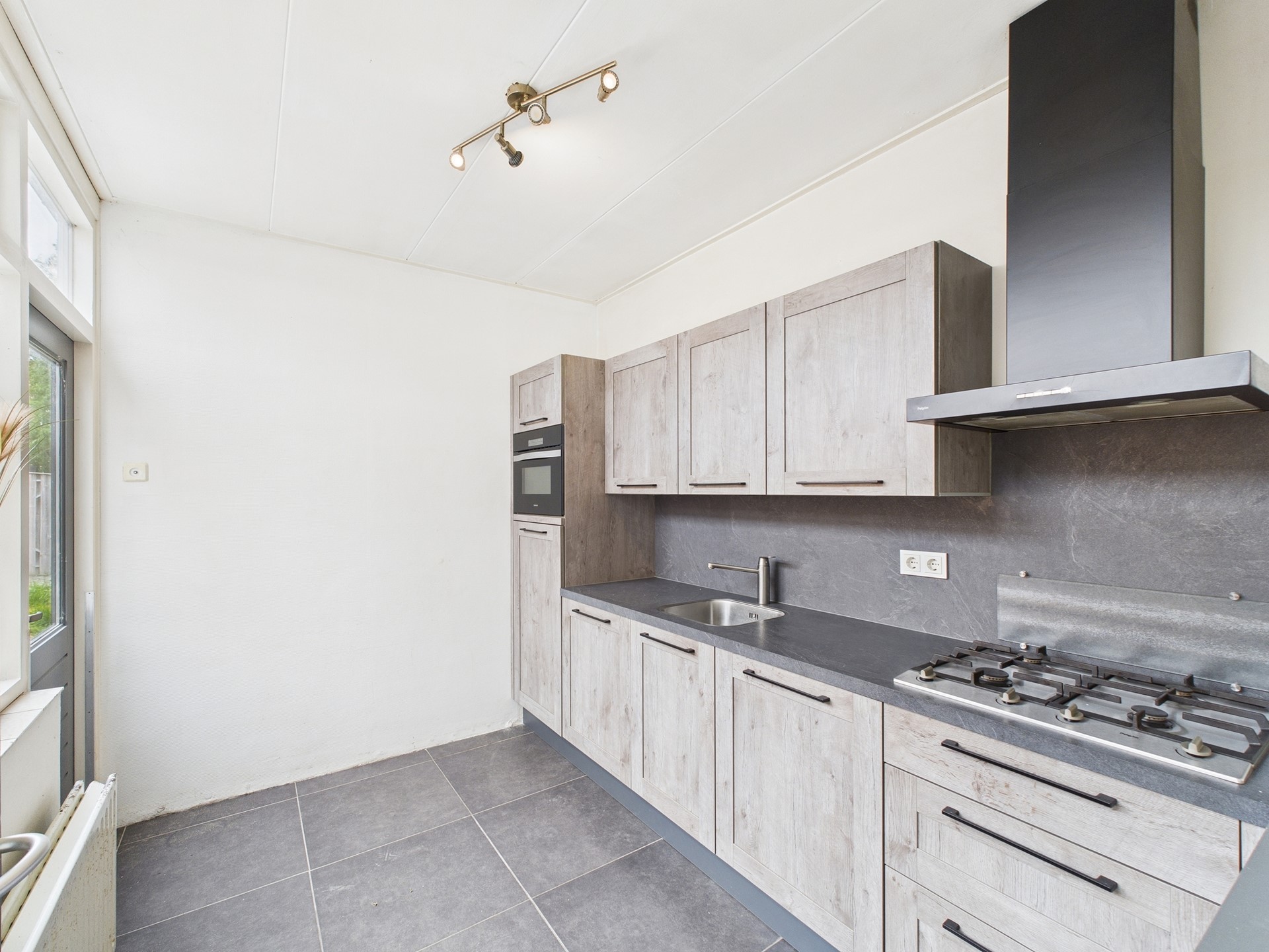 Inkomhal met meterkast, opgaande trap met trapkast en toegang naar toilet en woonkamer. De woonkamer is een open ruimte met grote ramen aan de voorzijde en achterzijde waardoor er veel licht naar binnen valt. De woonkamer is voorzien van een nette laminaat vloer, verder is de ruimte nog volledig naar eigen smaak aan te passen. Dankzij de rechthoekige indeling is er volop plek voor een gezellige zithoek én een ruime eethoek. Een ideale leefruimte om helemaal naar wens in te richten. De keuken bevindt zich in de uitbouw en is vernieuwd en voorzien van diverse inbouwapparatuur zoals een gasfornuis, afzuigkap, koelkast, oven en vaatwasser.