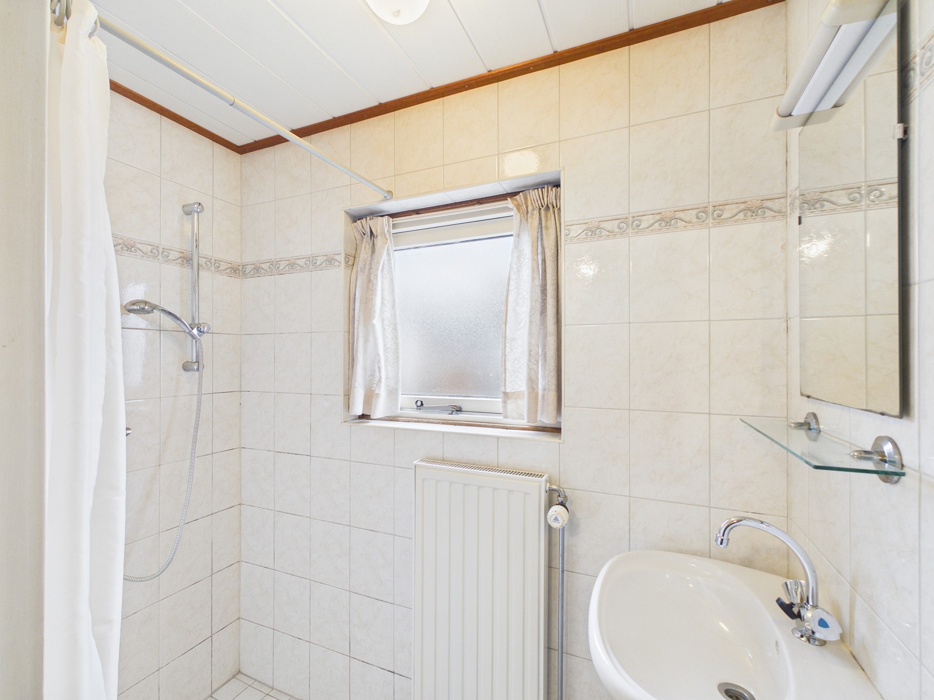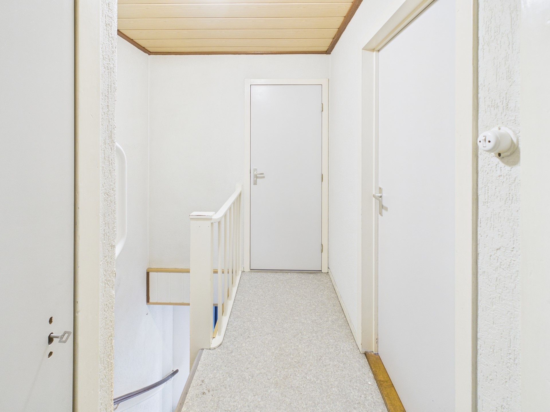 Overloop met toegang naar 3 slaapkamers en badkamer. Een van de slaapkamers beschikt over de aansluiting van de wasmachine en is dan ook ingericht als wasruimte. De badkamer is volledig betegeld en beschikt over een douche en wastafel.