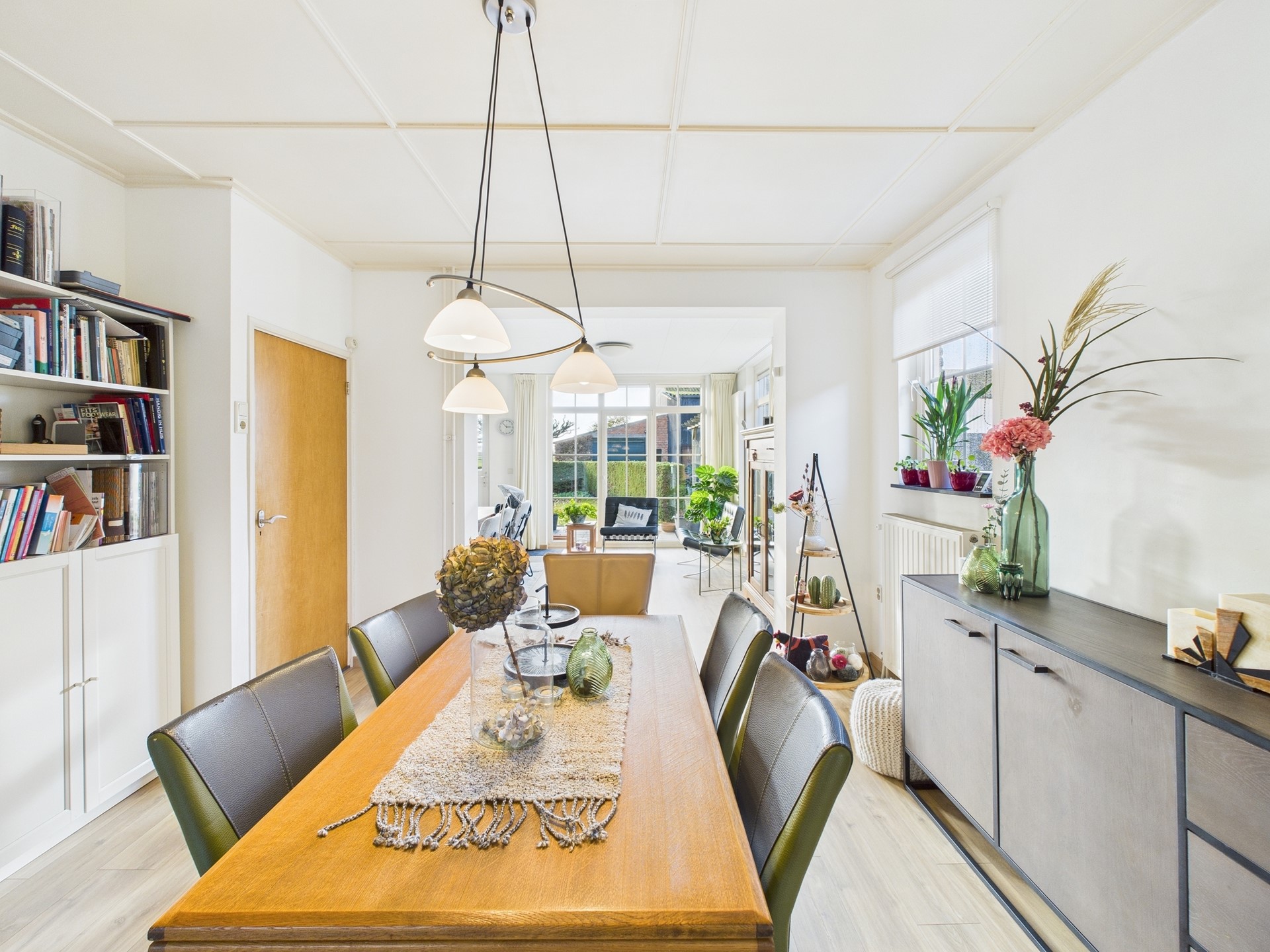 Inkomhal met opgaande trap naar de eerste verdieping, toegang tot de kelder en woonkamer. De woonkamer bestaat uit twee gedeeltes die van elkaar gescheiden kunnen worden met mooie ensuite deuren. Aan de andere kant van de deuren vind je een tweede zithoek. In de aanbouw bevindt zich de grote leefkeuken. Deze ruimte is het hart van het huis, er is genoeg plaats voor een grote eettafel én een zithoek. Ook is er hier airconditioning aanwezig. De keuken is voorzien van alle benodigde inbouwapparatuur en biedt daarnaast ruimte voor een grote eethoek om gezellig samen te eten met vrienden en familie. Door de grote ramen is de ruimte heerlijk licht en geniet je van het uitzicht op de tuin. Via een binnendeur in de woonkamer bereik je de praktische bijkeuken, voorzien van aansluitingen voor apparatuur en een aparte wasruimte. Vanuit de bijkeuken is ook het toilet bereikbaar.