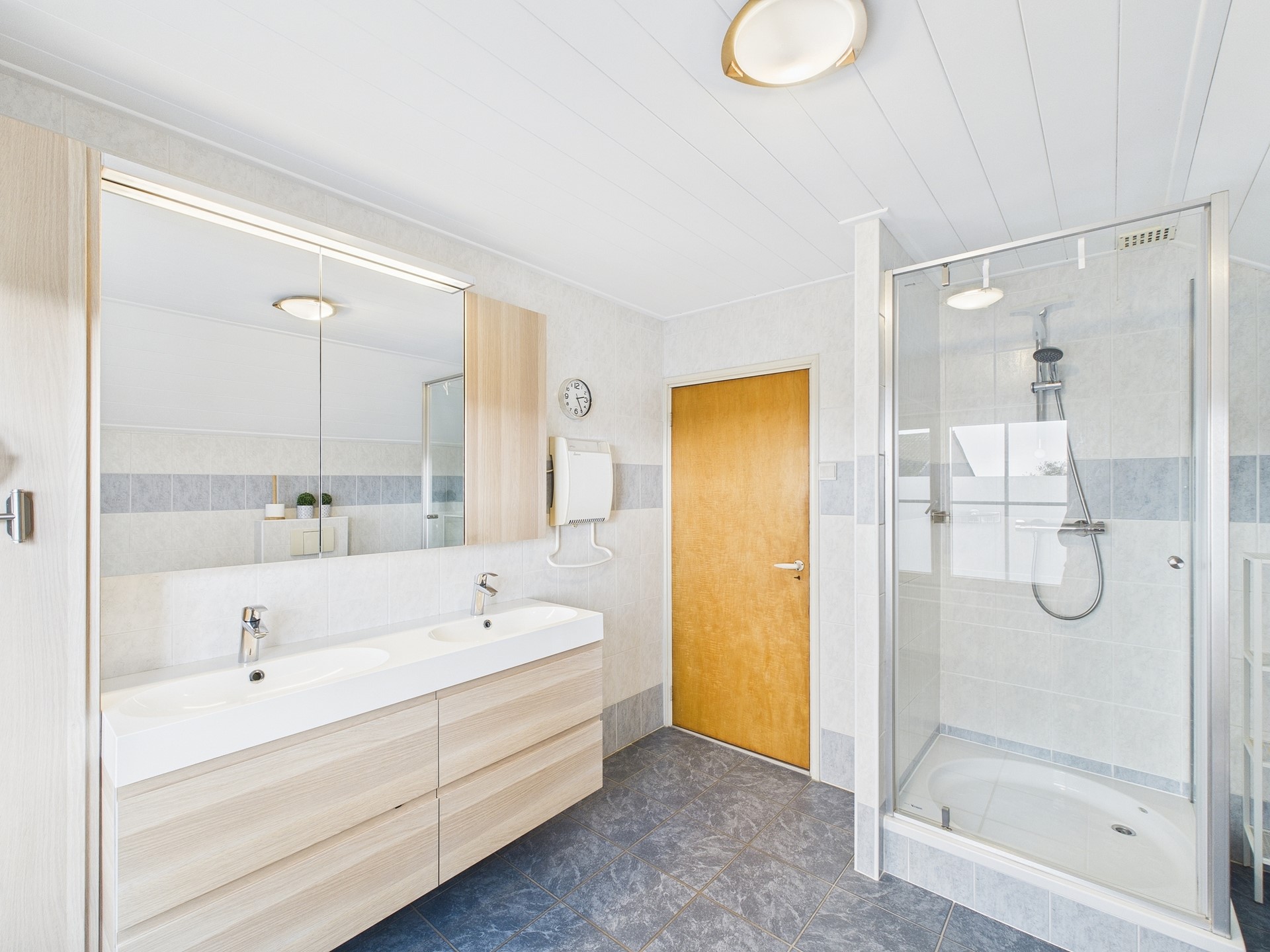 Op de eerste verdieping bevinden zich de overloop, drie ruime slaapkamers en een grote badkamer. Op één slaapkamer is airconditioning aanwezig. De badkamer is volledig betegeld en beschikt over een ligbad, douche, toilet en dubbele wastafel met meubel. Deze indeling maakt de woning geschikt voor zowel gezinnen als mensen die graag royaal en praktisch willen wonen, met volop mogelijkheden voor hobby’s, thuiswerken of logees.