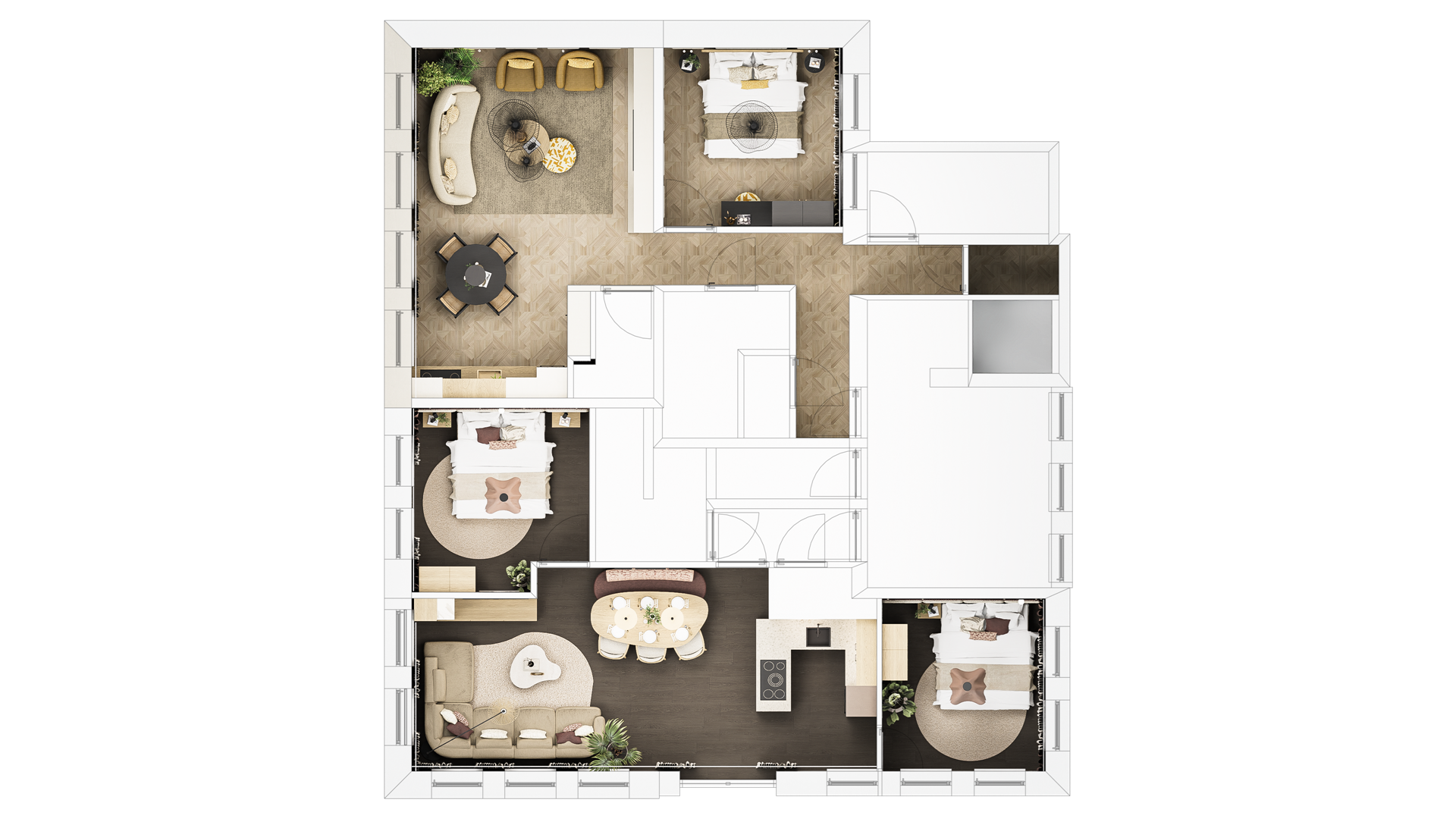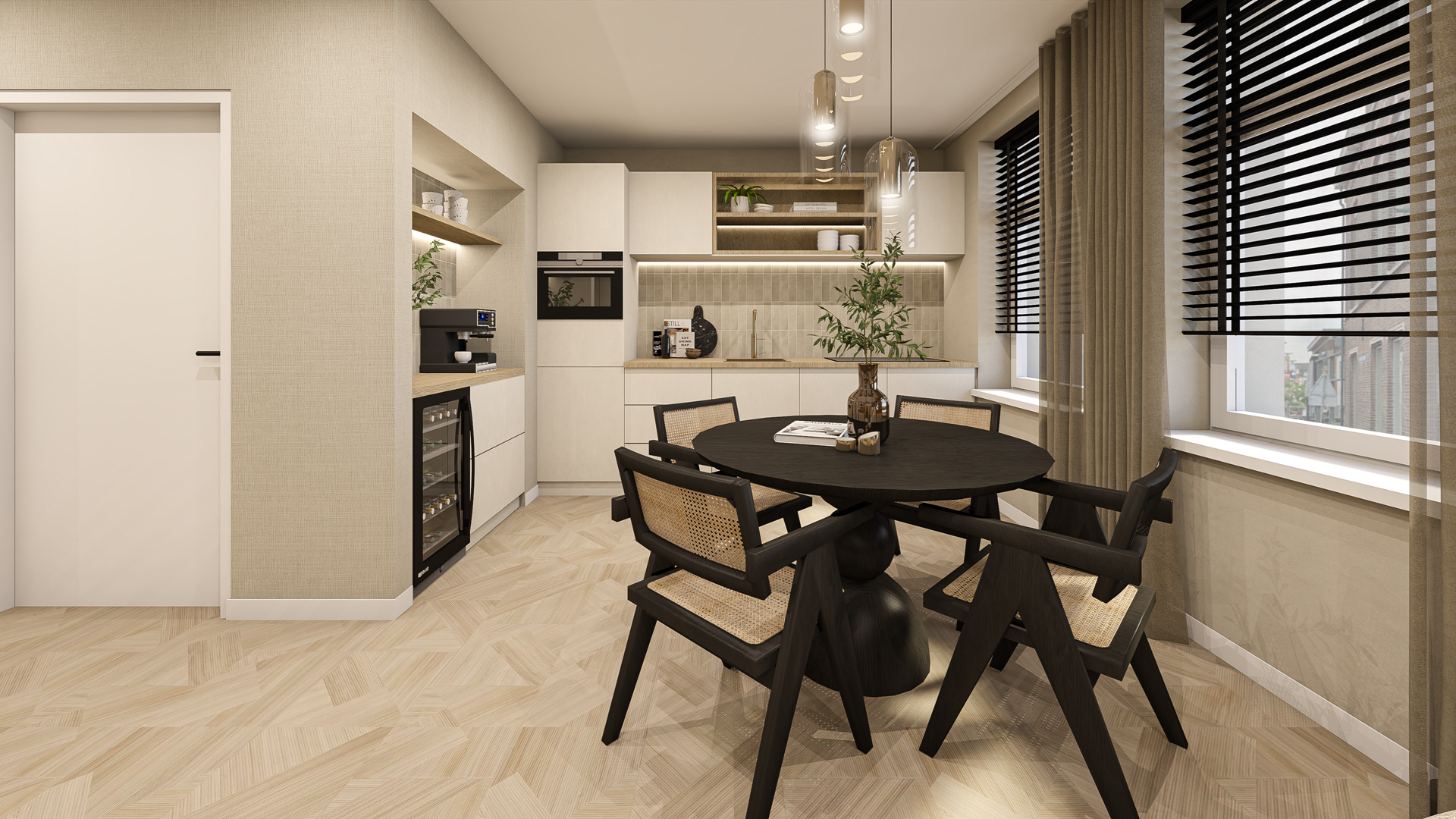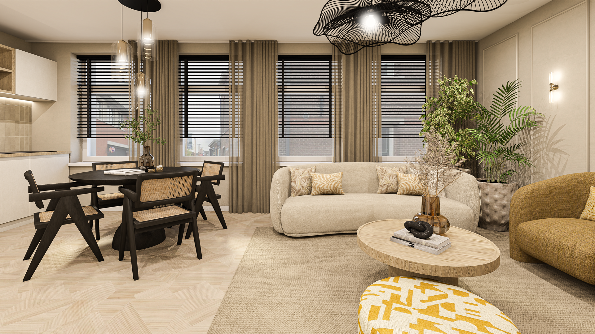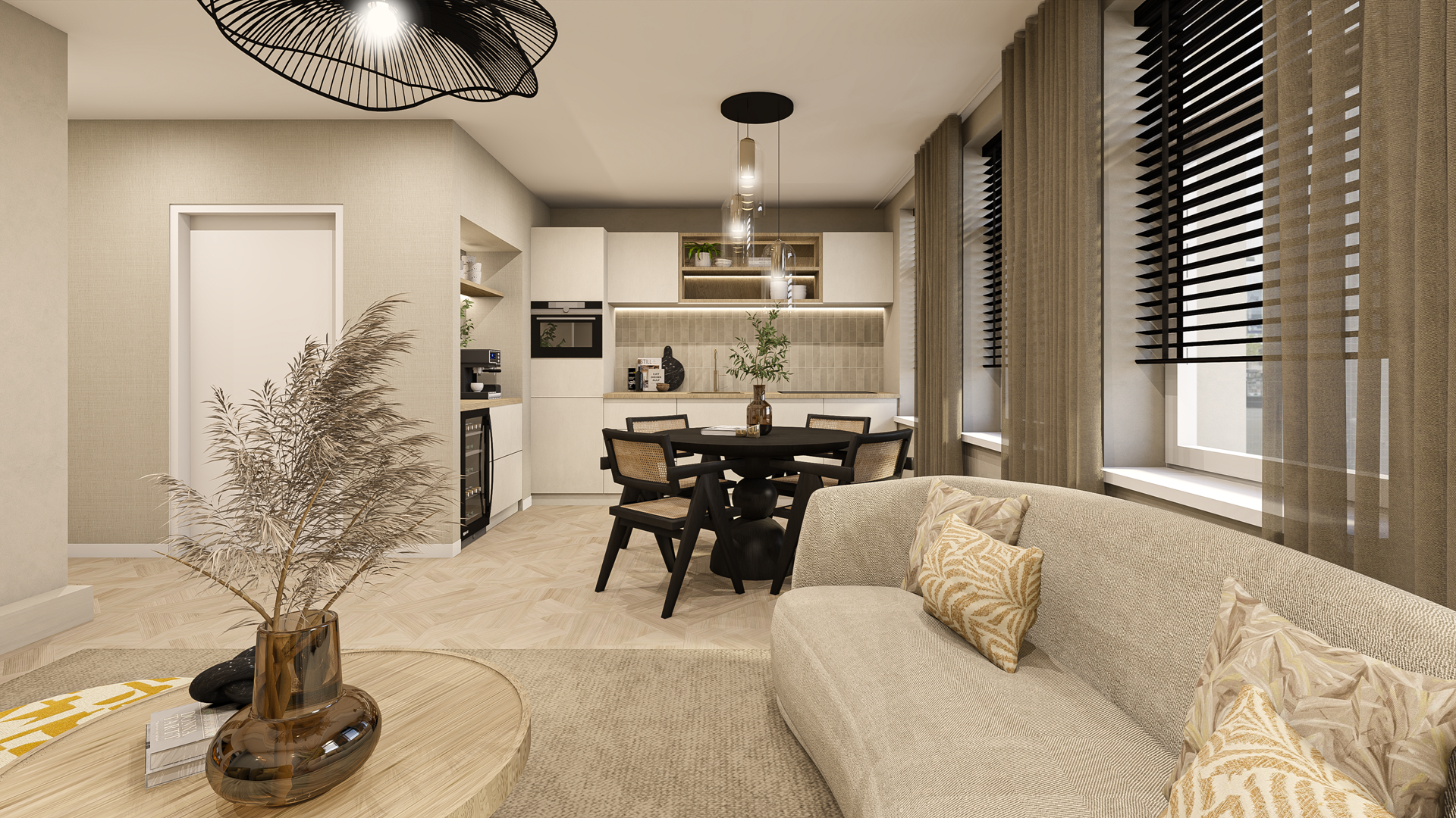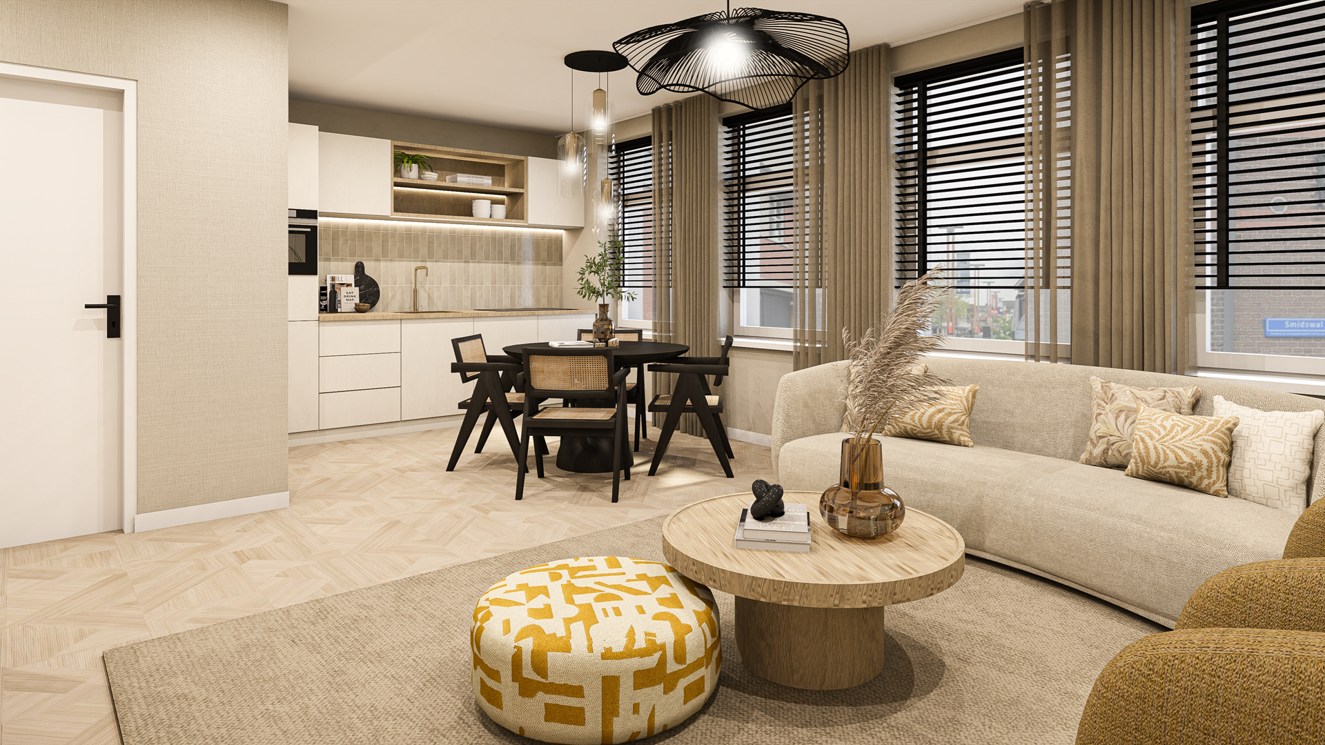 De woonkamer en keuken vormen samen één open leefruimte, wat zorgt voor een lichte, ruimtelijke en uitnodigende indeling. De grote raampartijen laten volop daglicht binnen en bieden een prettige verbinding met buiten. Er is meer dan genoeg ruimte voor zowel een comfortabele zithoek als een royale eethoek. Vanuit de hal heeft u toegang tot een balkon, waar genoeg plaats is voor een zithoek en u heerlijk kunt genieten van de buitenlucht.
