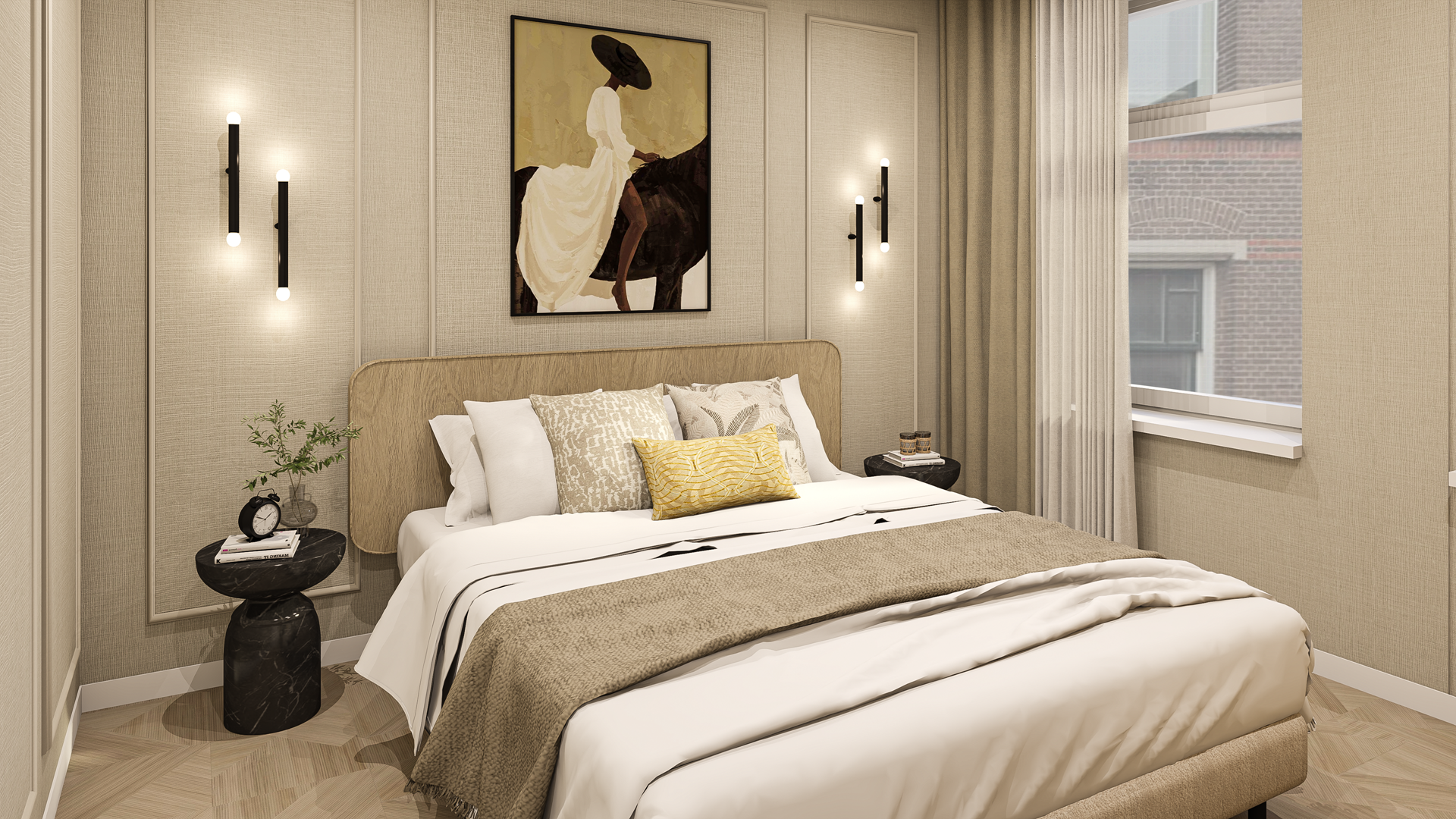 Verder beschikt het appartement over een ruime slaapkamer. De badkamer is modern vormgegeven, volledig betegeld en voorzien van een hangtoilet, douche en wastafelmeubel.
