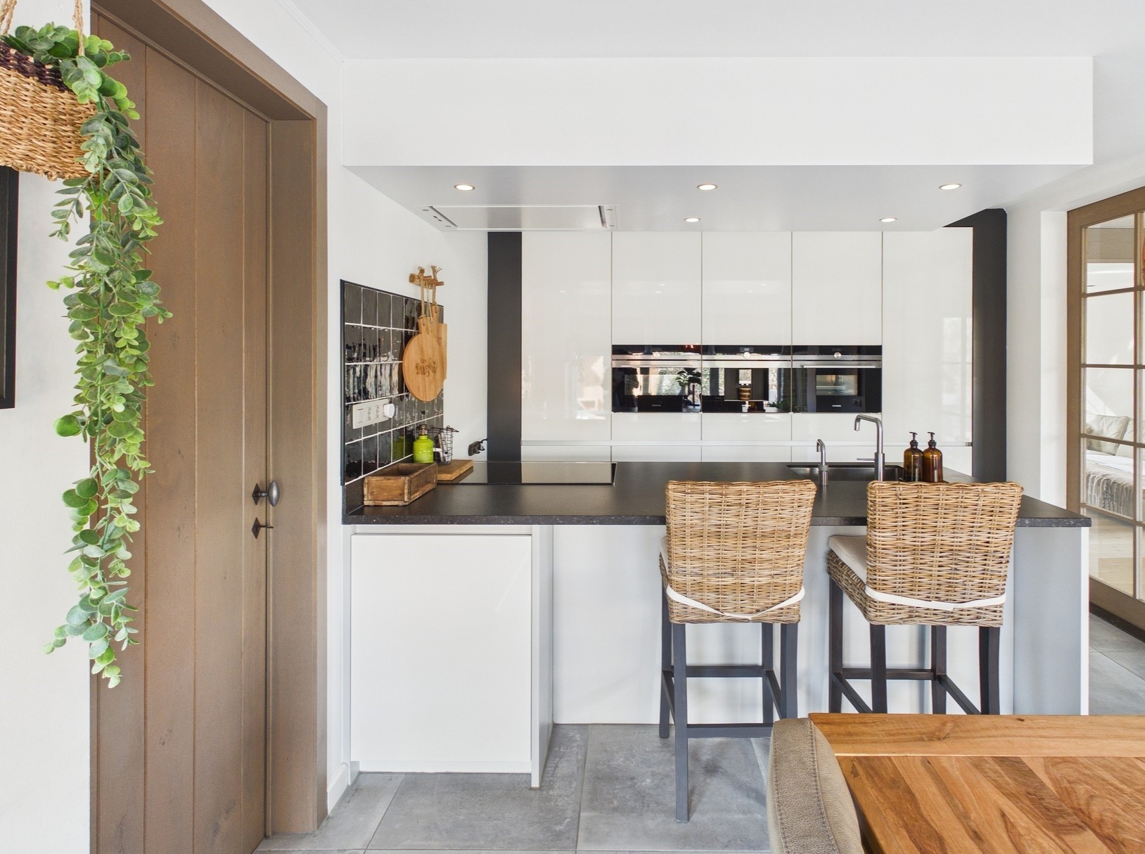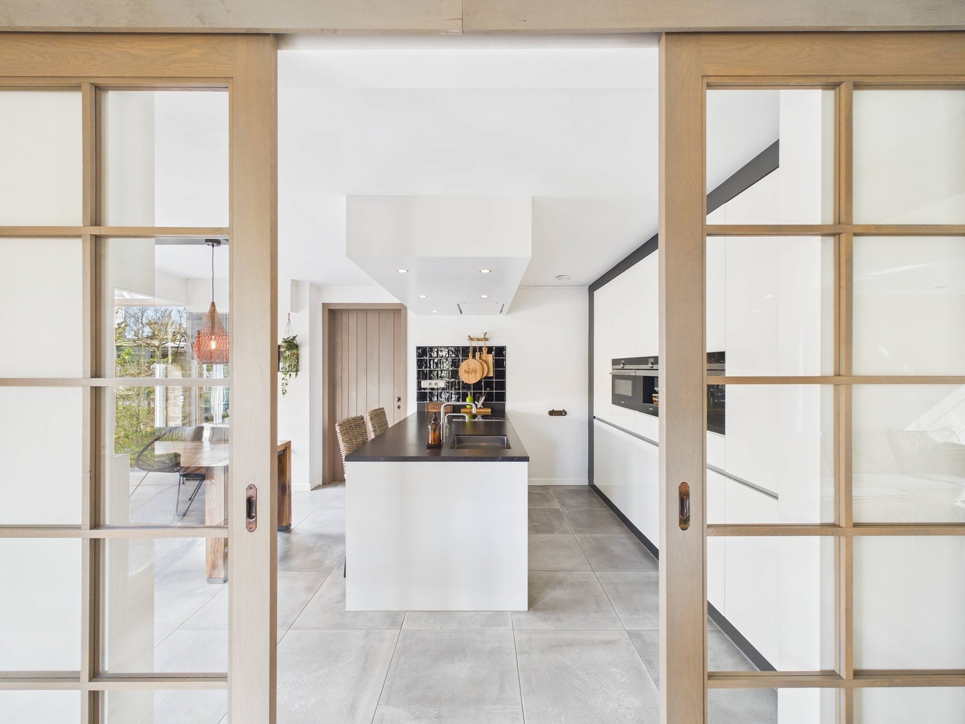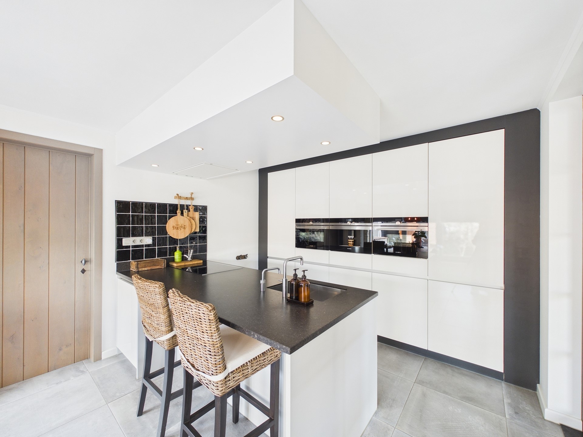 De luxe keuken is uitgerust met een kookeiland en diverse inbouwapparatuur, waaronder een koffiemachine, stoomoven, koelkast, vriezer, Quooker en vaatwasser. Vanuit de keuken is er toegang naar de bijkeuken en een multifunctionele ruimte (voormalige salonruimte). De bijkeuken beschikt over praktische kasten, wasmachineaansluiting en er is toegang naar de tuin.