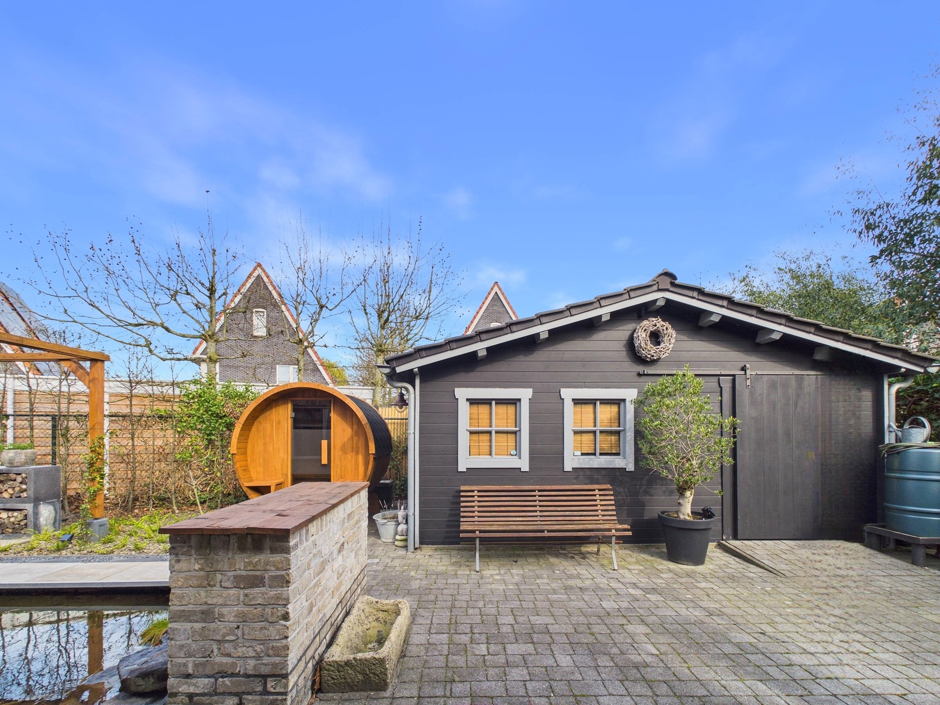 De schitterende tuin is een echte eyecatcher en beschikt over meerdere terrassen, een sauna en een tuinhuis. Deze tuin is een heerlijke plek om te relaxen en te genieten van rust en privacy. Daarnaast zul je hier altijd een plekje in de zon vinden. Er is een tuinhuis aanwezig, deze biedt meer dan voldoende ruimte voor het stallen van fietsen en tuingereedschap.
