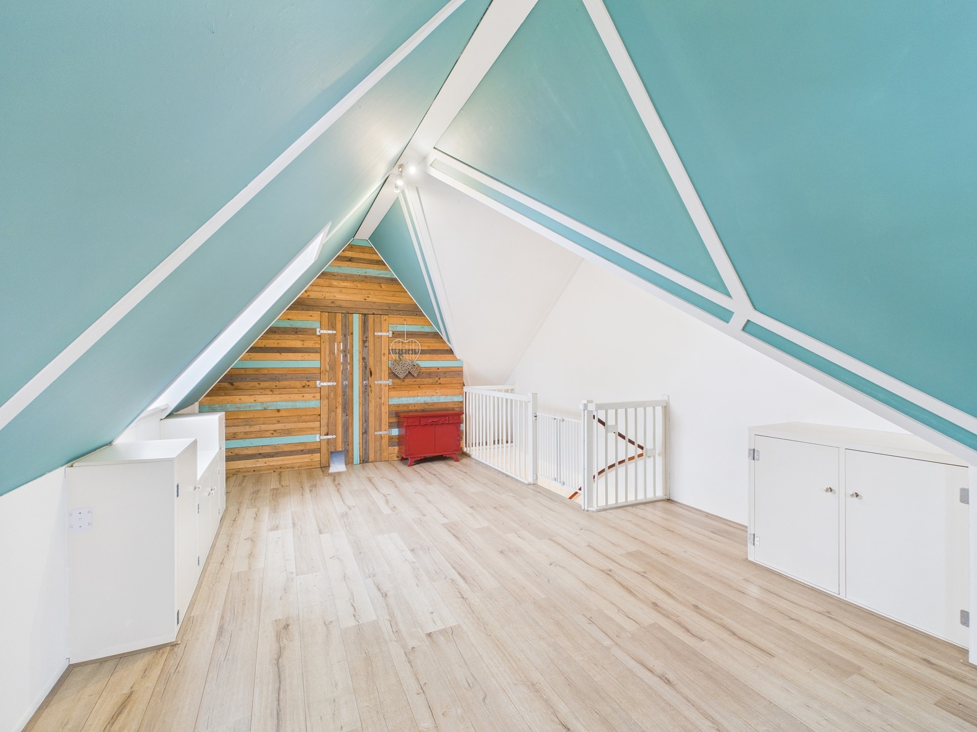 De tweede verdieping is bereikbaar middels een vast trap. Door middel van twee mooie houten klapdeuren is de ruimte gescheiden in twee delen. Het voorste gedeelte kan gebruikt worden als slaapkamer of hobbyruimte. Door de dakkapel is de zolder extra licht en ruim en geeft zelfs de mogelijkheid om deze nog op te delen in twee slaapkamers. Achter de houten deuren bevindt zich de technische ruimte met de warmtepomp en de aansluiting voor de wasmachine.
