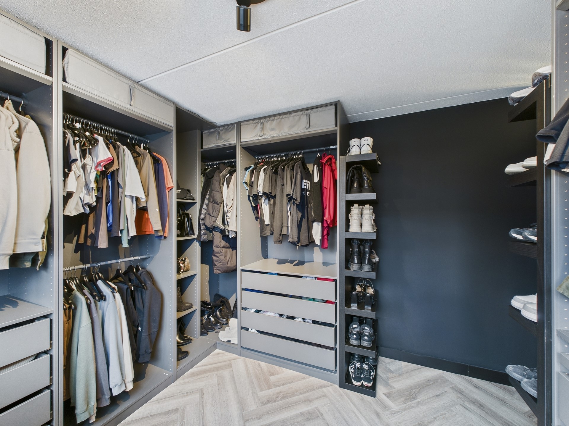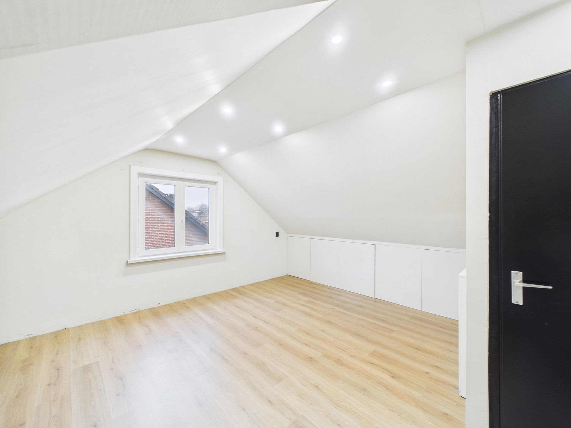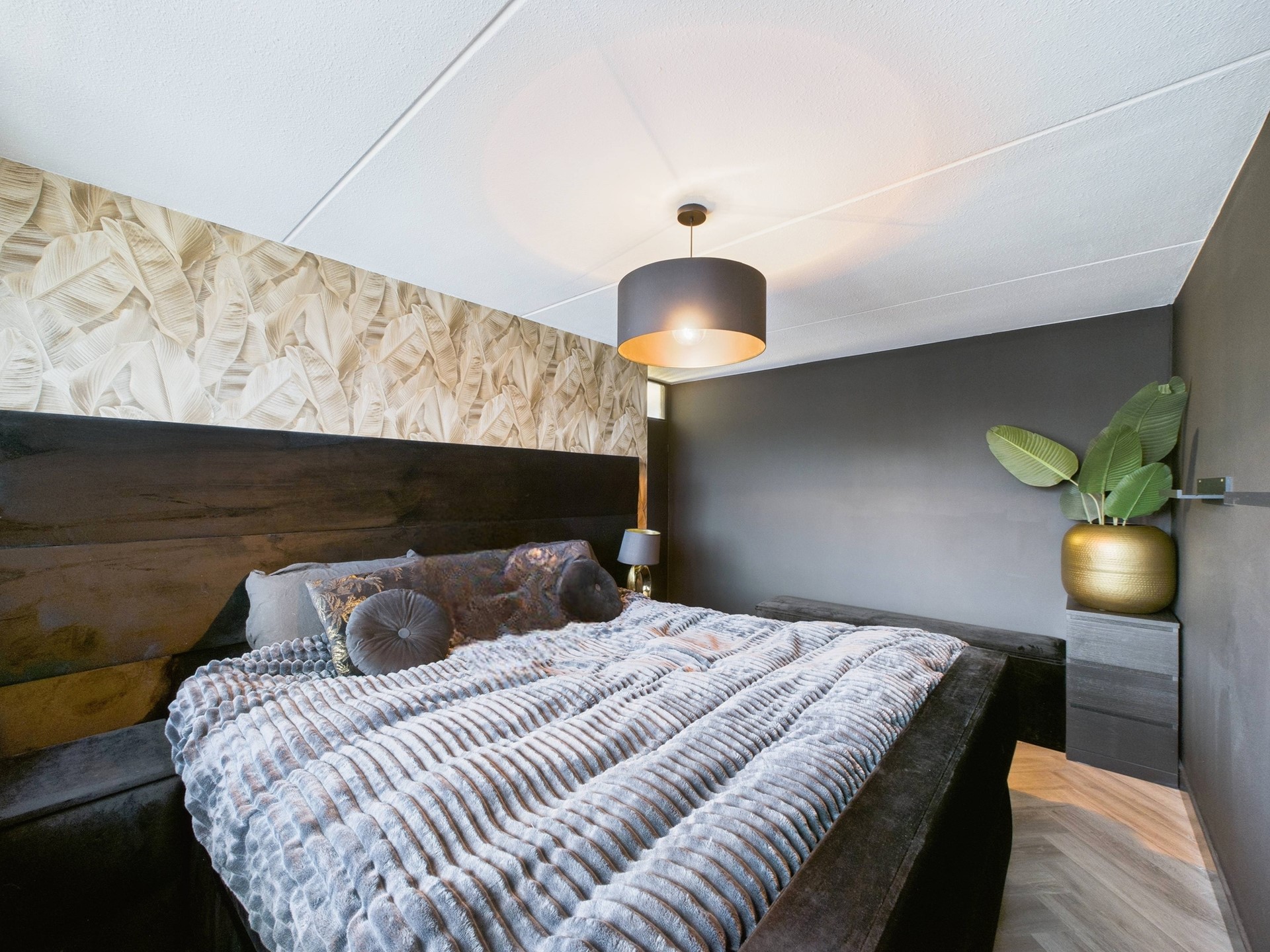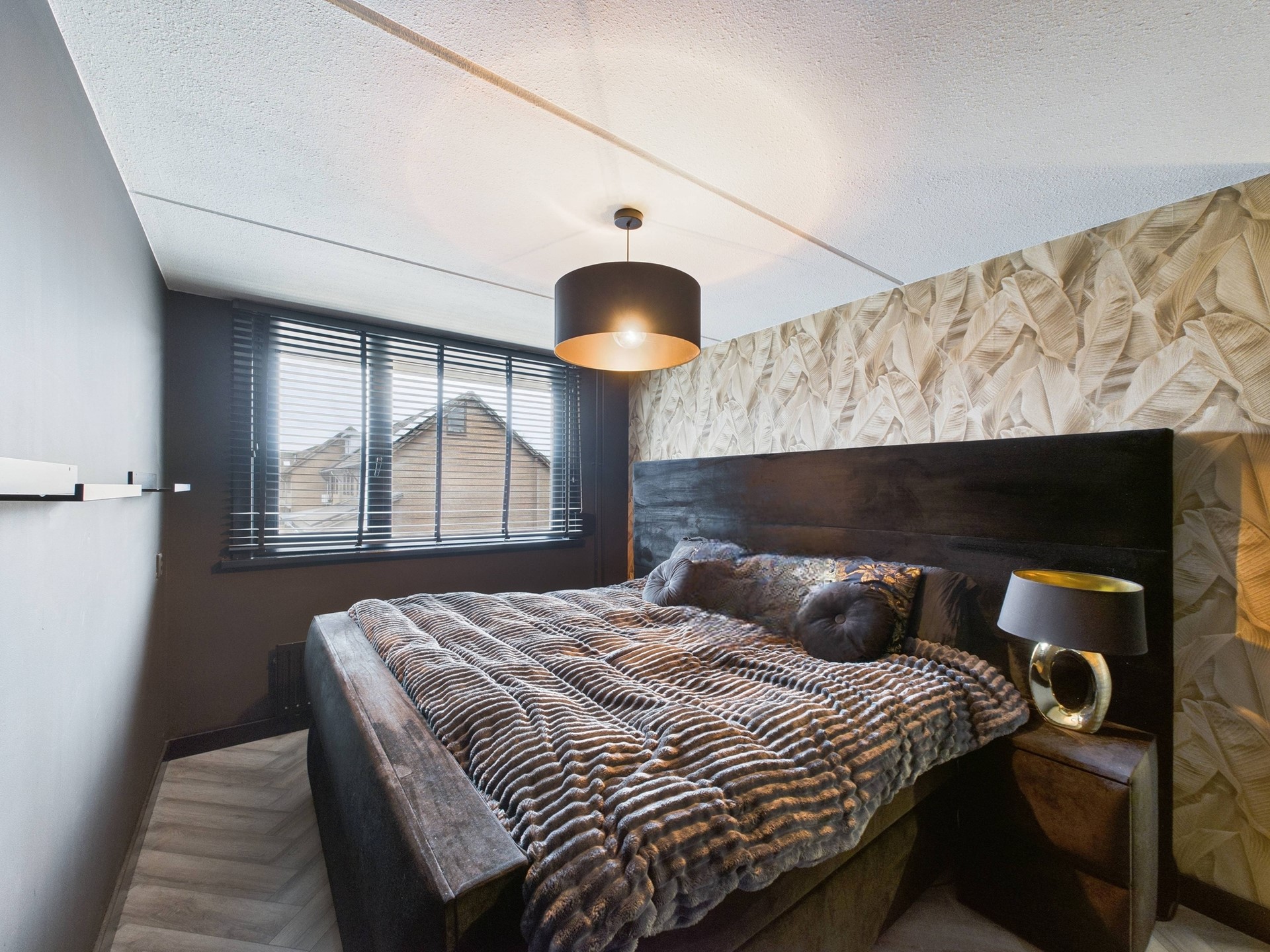 De eerste verdieping beschikt over drie slaapkamers en een nette badkamer. Ook hier is de hotel chique afwerking met visgraatvloer en zwarte accenten consequent doorgevoerd, wat zorgt voor een luxe en rustige uitstraling. Eén van de slaapkamers is ingericht als walk-in closet, ideaal voor extra comfort en opbergruimte. De badkamer is compleet uitgevoerd met een douche, toilet en wastafelmeubel.