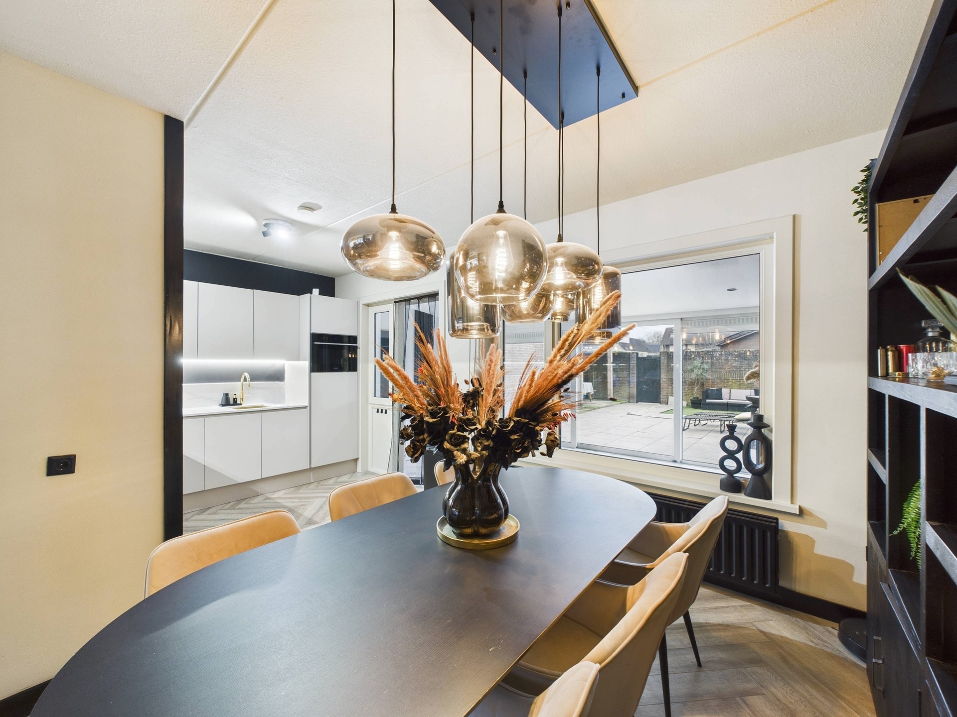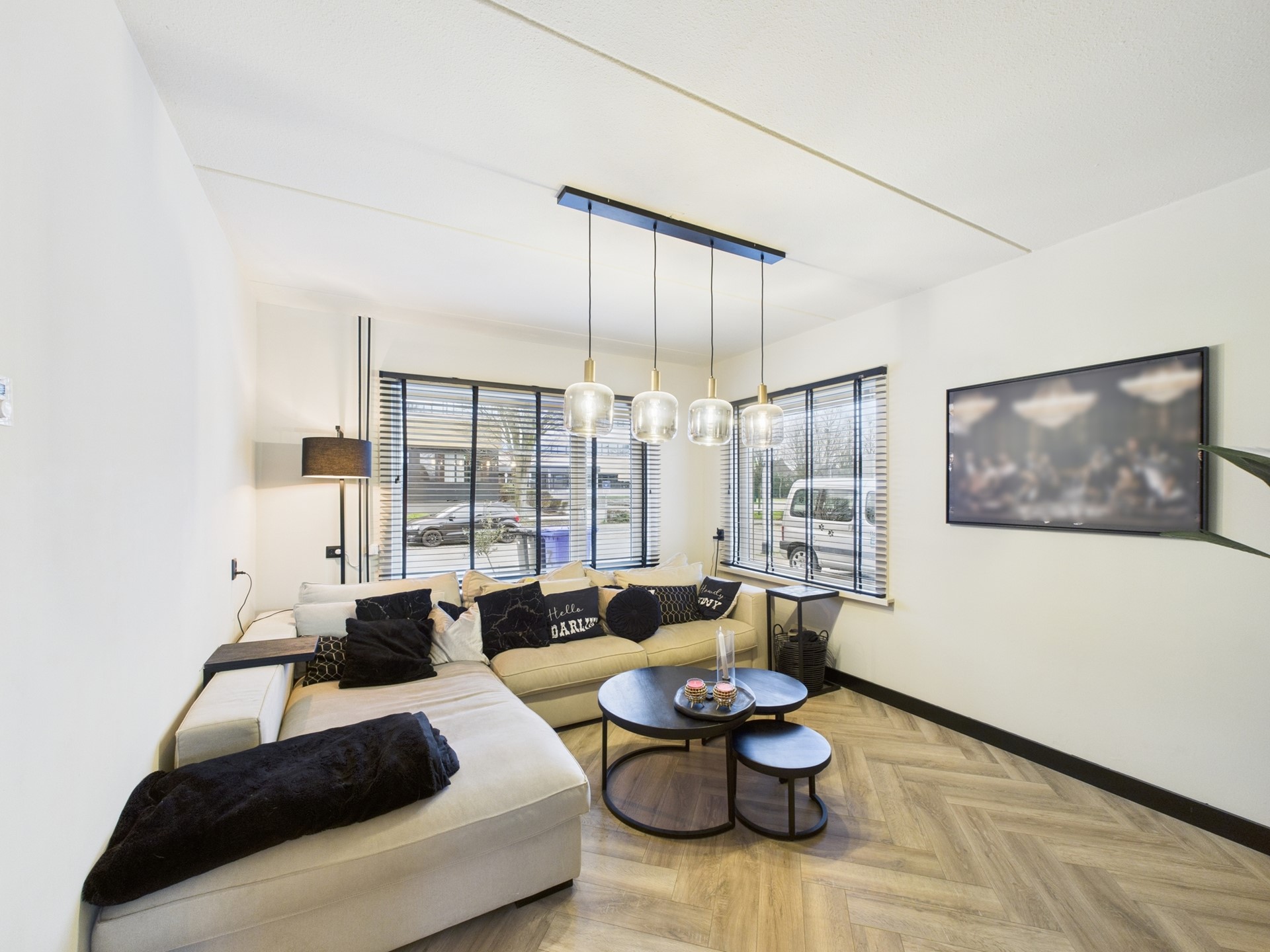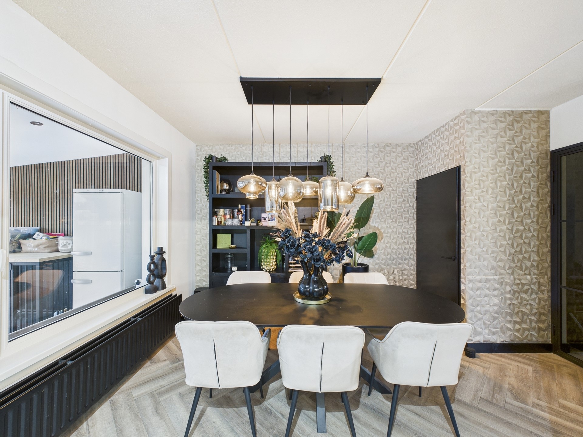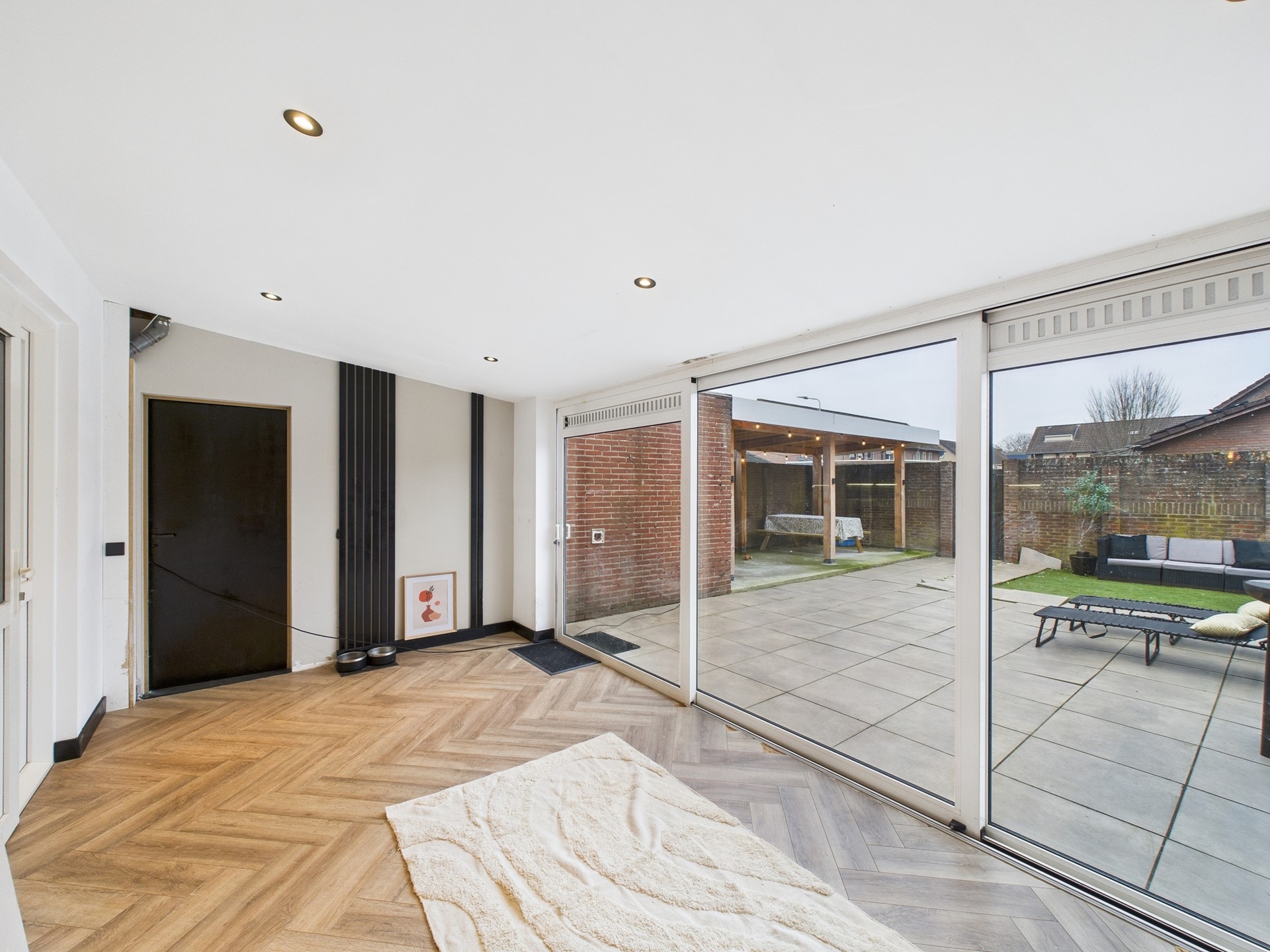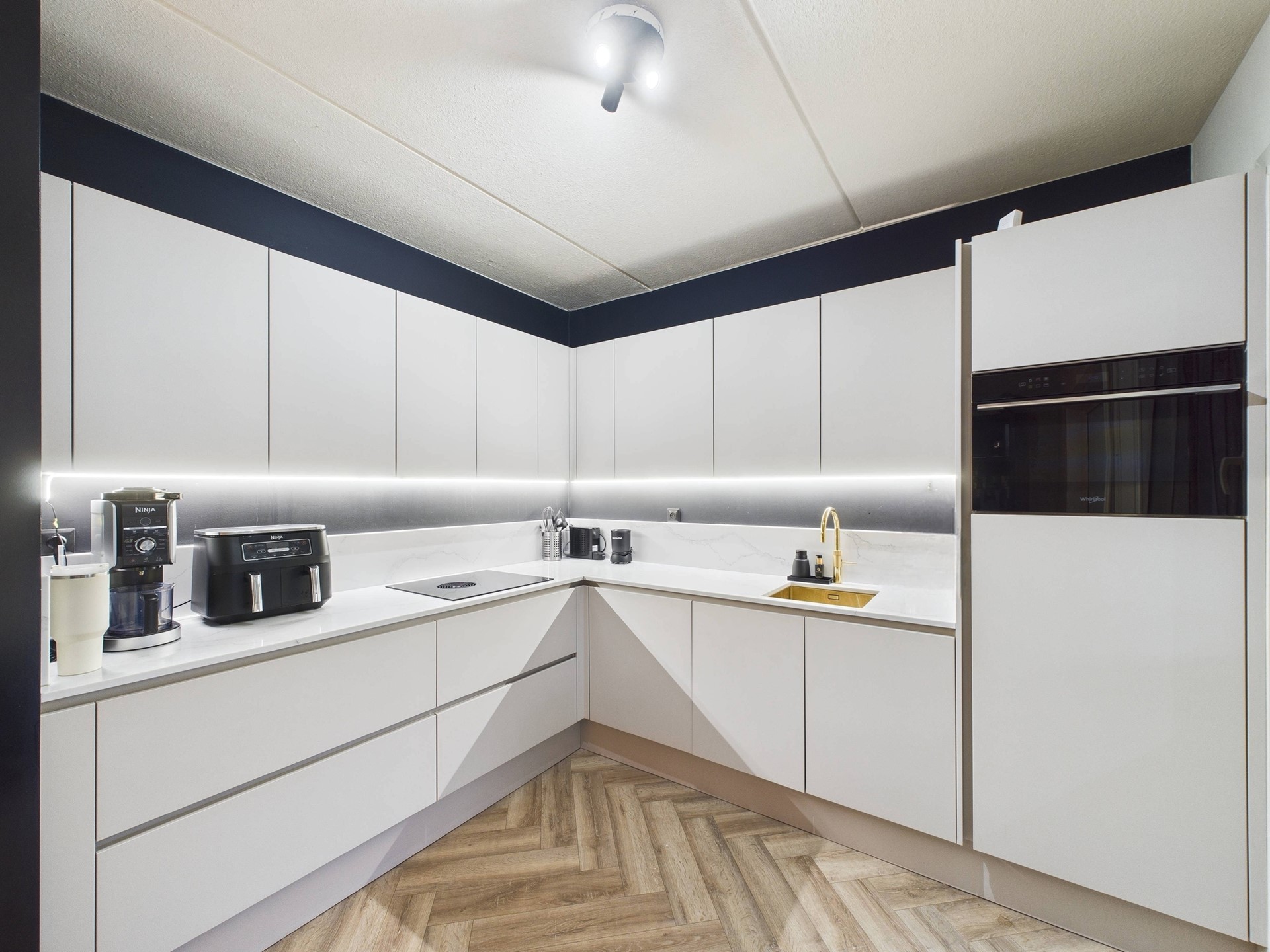 De eerste verdieping beschikt over drie slaapkamers en een nette badkamer. Ook hier is de hotel chique afwerking met visgraatvloer en zwarte accenten consequent doorgevoerd, wat zorgt voor een luxe en rustige uitstraling. Eén van de slaapkamers is ingericht als walk-in closet, ideaal voor extra comfort en opbergruimte. De badkamer is compleet uitgevoerd met een douche, toilet en wastafelmeubel.