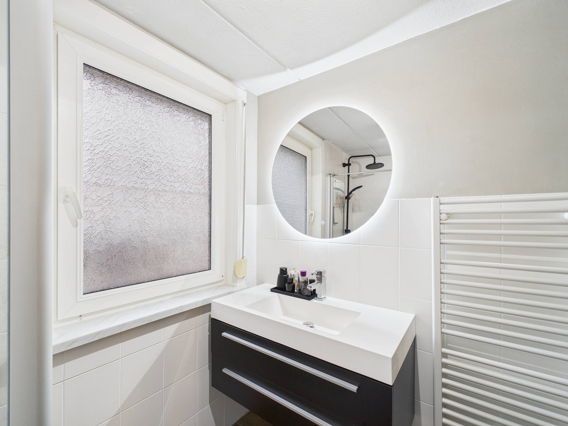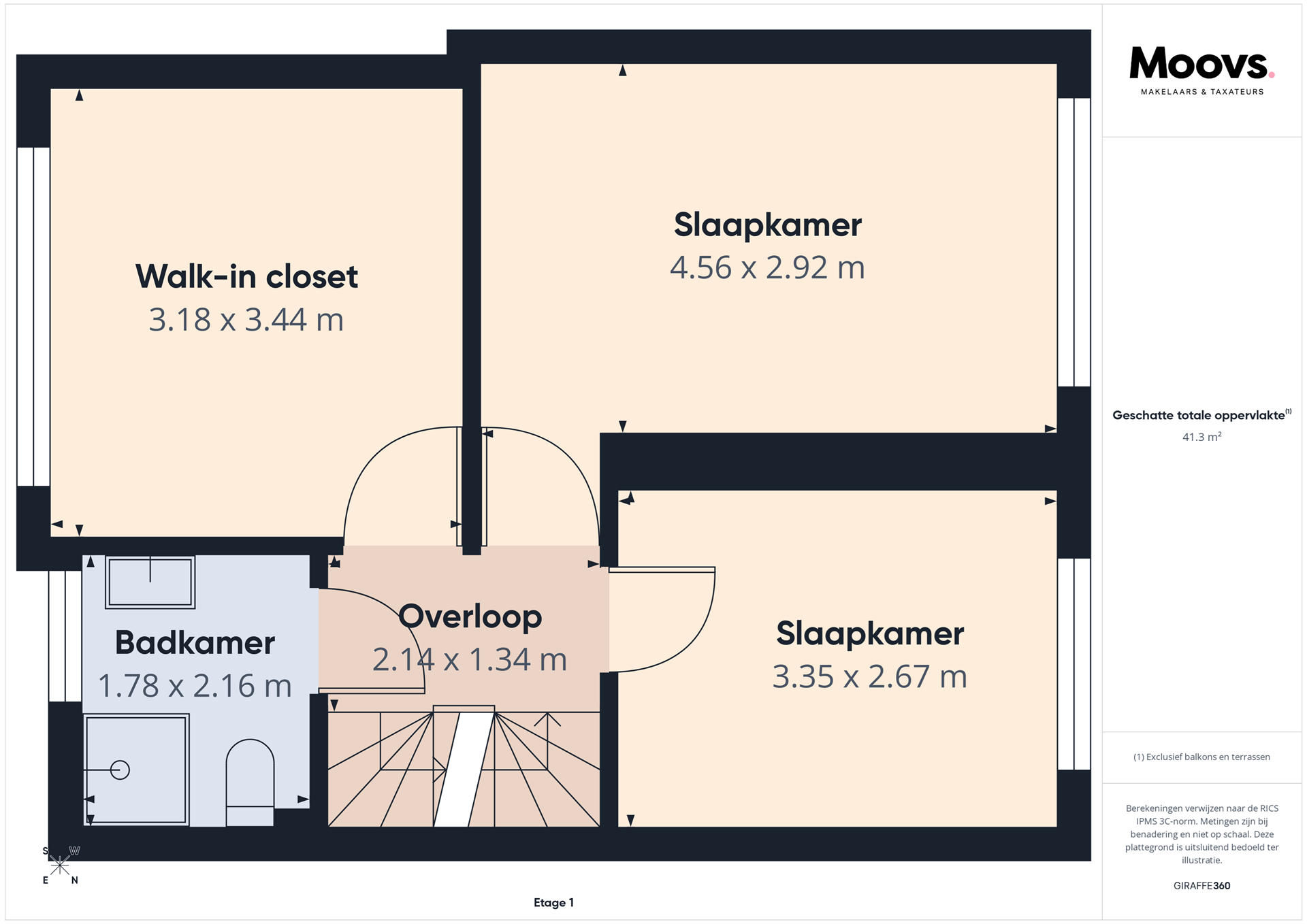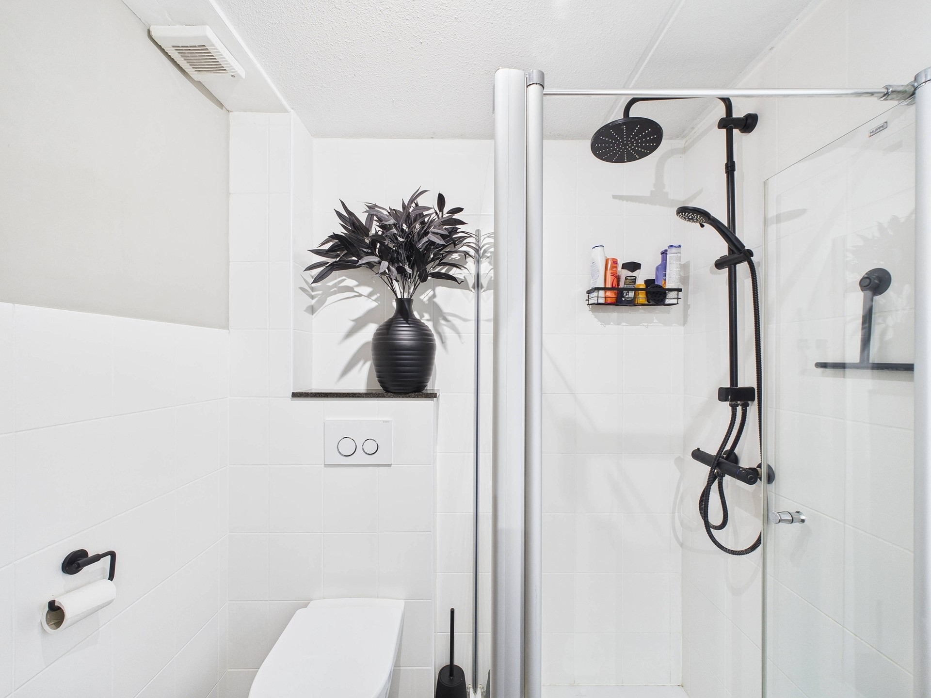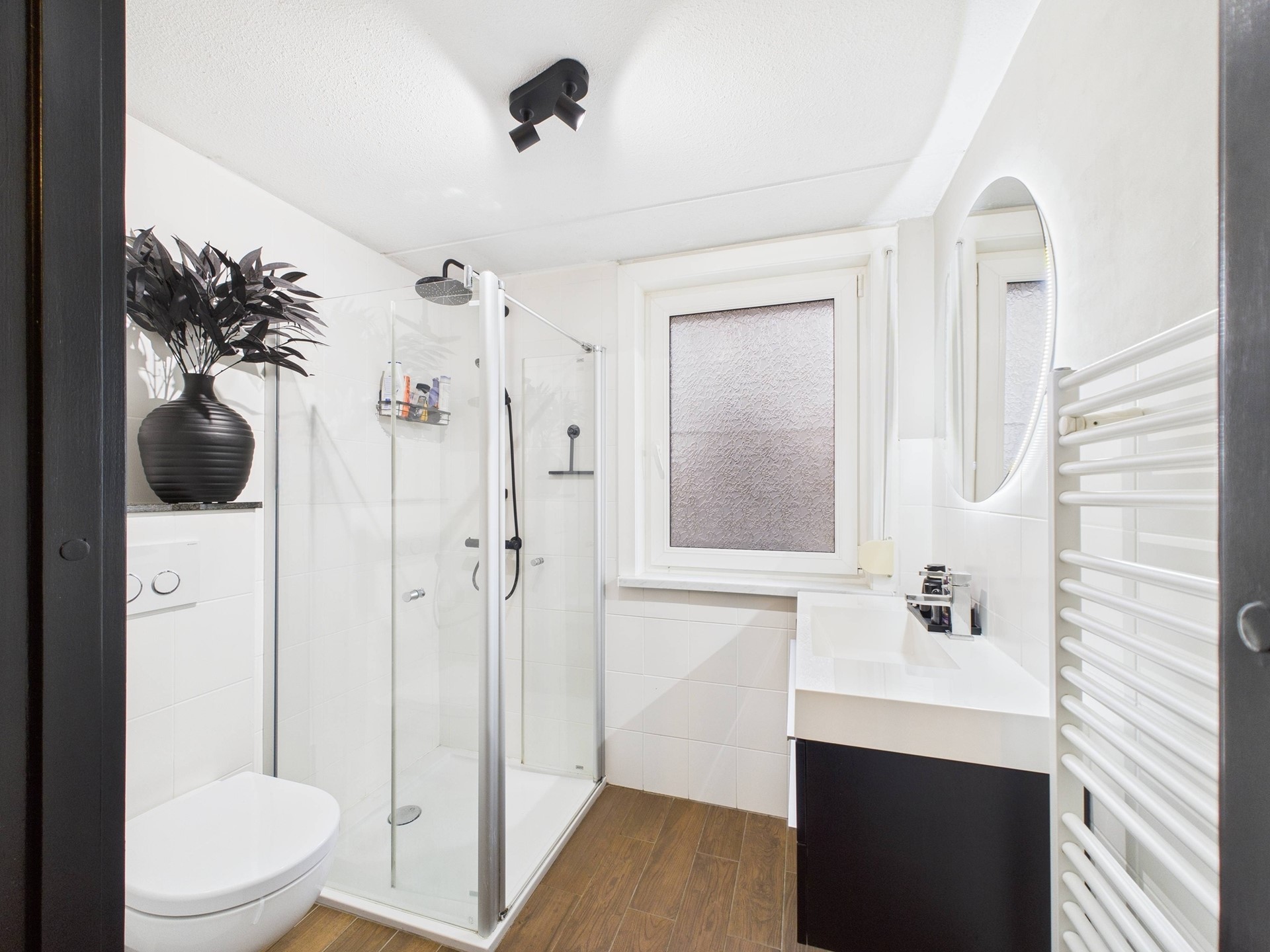 De eerste verdieping beschikt over drie slaapkamers en een nette badkamer. Ook hier is de hotel chique afwerking met visgraatvloer en zwarte accenten consequent doorgevoerd, wat zorgt voor een luxe en rustige uitstraling. Eén van de slaapkamers is ingericht als walk-in closet, ideaal voor extra comfort en opbergruimte. De badkamer is compleet uitgevoerd met een douche, toilet en wastafelmeubel.