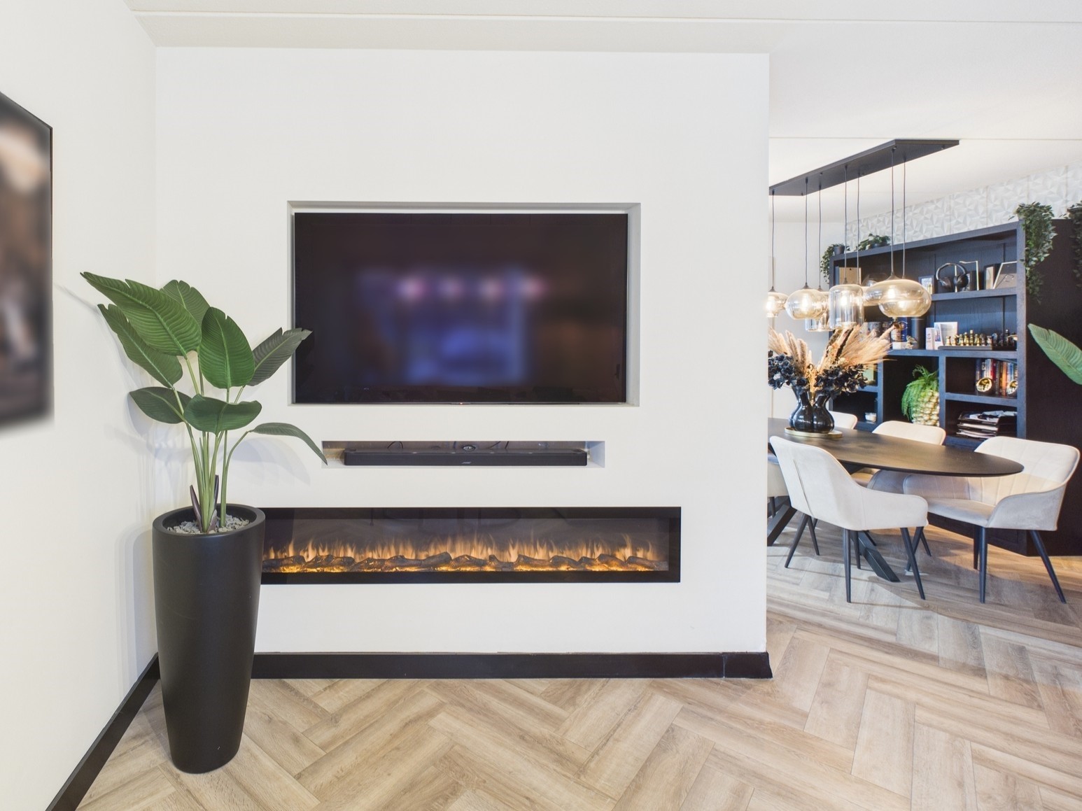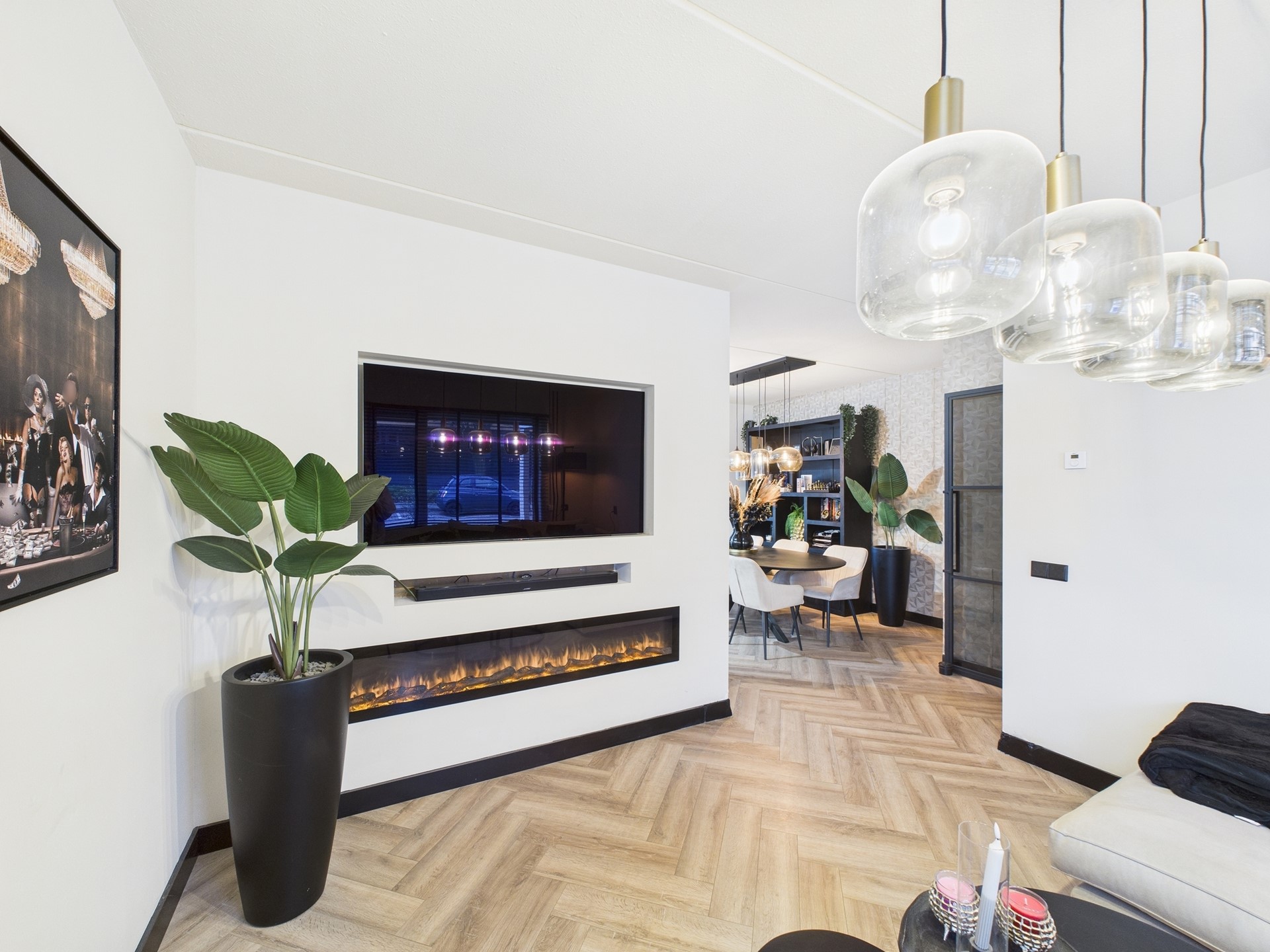 Inkomhal met toegang tot het toilet, de meterkast en de woonkamer. De stalen deur met glas geeft al een doorkijkje naar de hotel chique woonkamer. De gezellige woonkamer is voorzien van een visgraat vloer en beschikt over een cinewall met hieronder een sfeerhaard. Aansluitend bevinden zich de ruime eethoek en moderne keuken. De keuken is voorzien van alle benodigde inbouwapparatuur zoals inductiekookplaat met geïntegreerde afzuiging, Quooker kraan, een oven, vaatwasser en koelkast. De aangebouwde serre zorgt voor extra wooncomfort en veel lichtinval, waardoor binnen en buiten mooi in elkaar overlopen. Daarnaast beschikt de woning over een garage met aangrenzende bijkeuken, wat zorgt voor extra bergruimte en praktisch gemak.