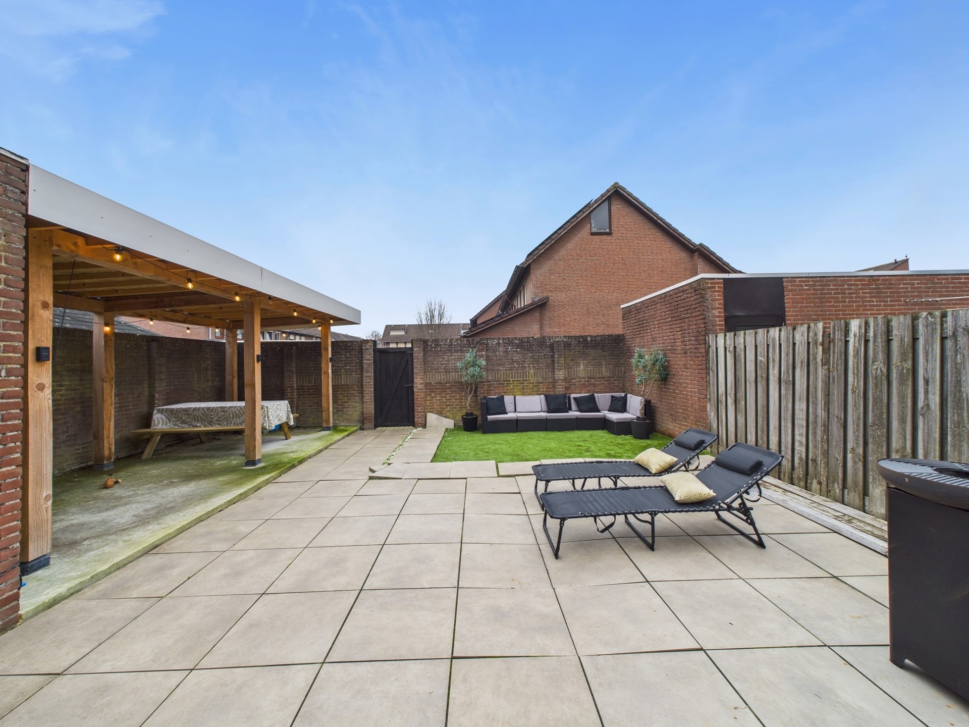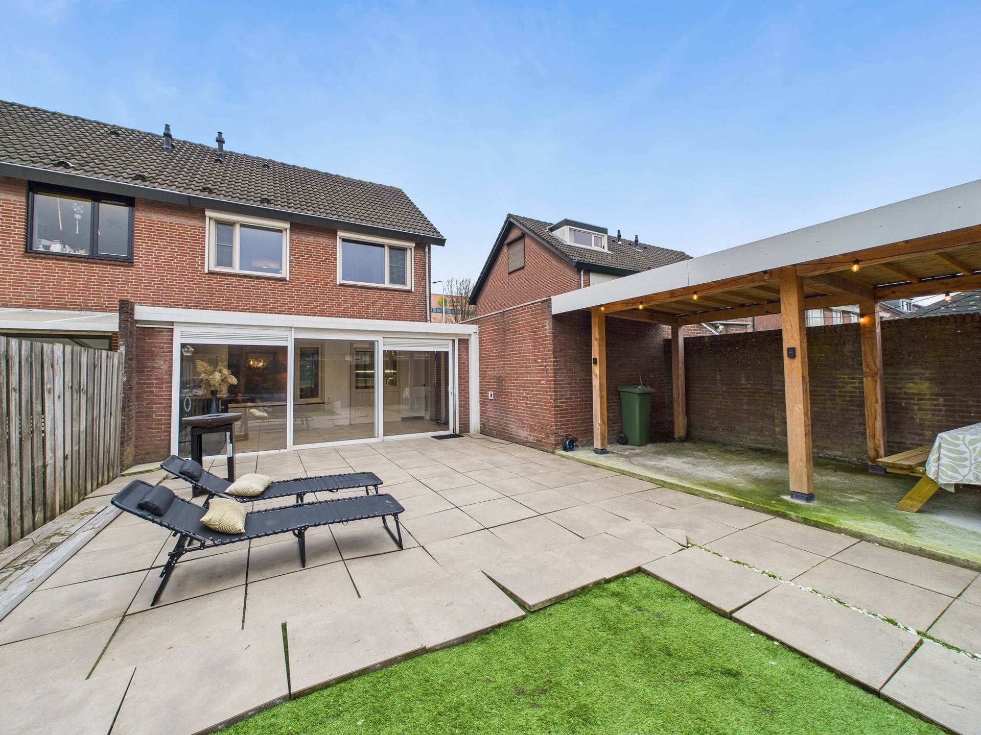 Onderhoudsvriendelijke tuin gelegen op het Noordwesten. De tuin is grotendeels voorzien van moderne tegels en deels van een strook kunstgras. Ook is er een ruime overkapping aanwezig. Genoeg plek om heerlijk te genieten in zowel het zonnetje of op de warme zomerdagen lekker de schaduw op te zoeken.
