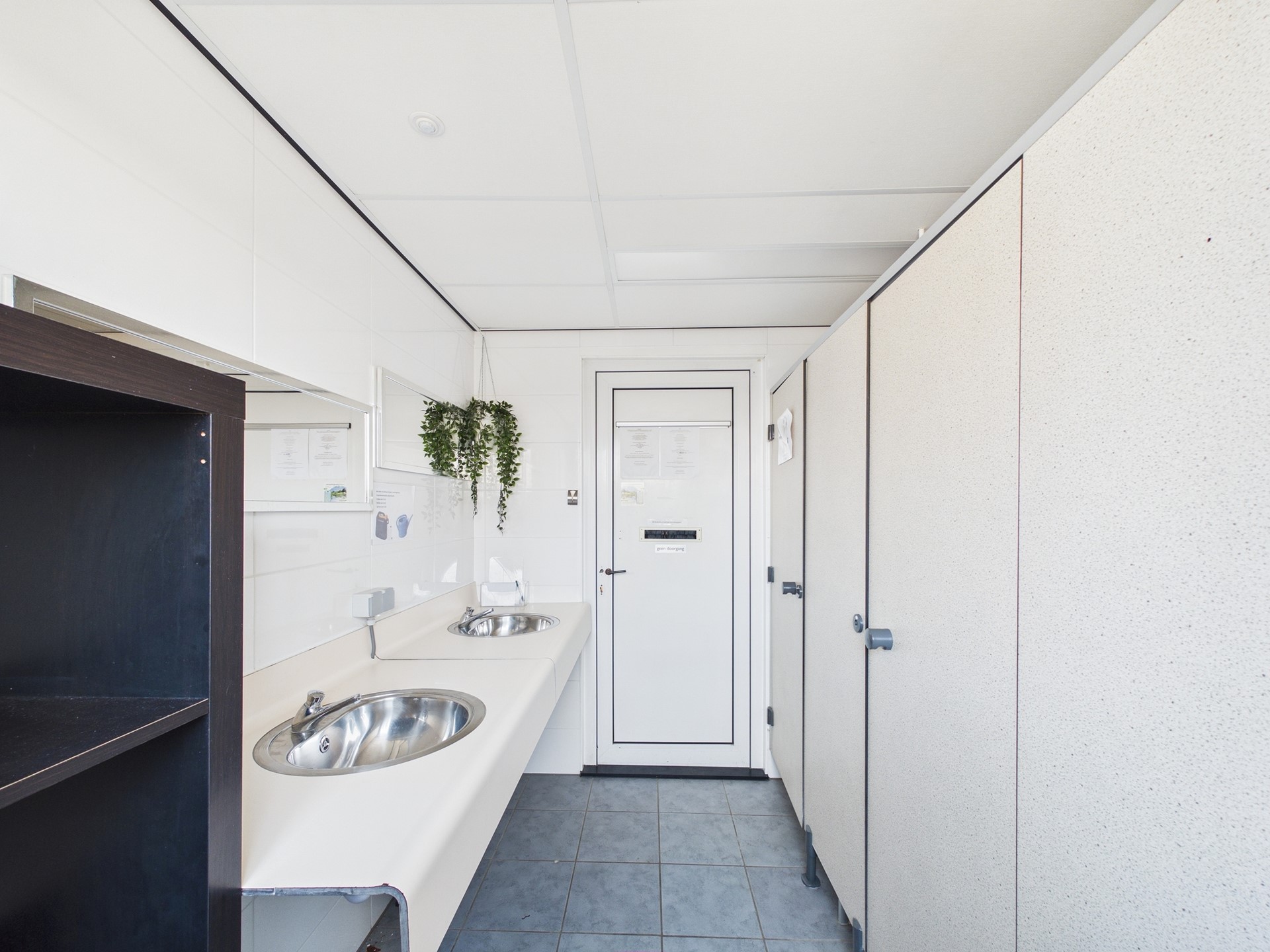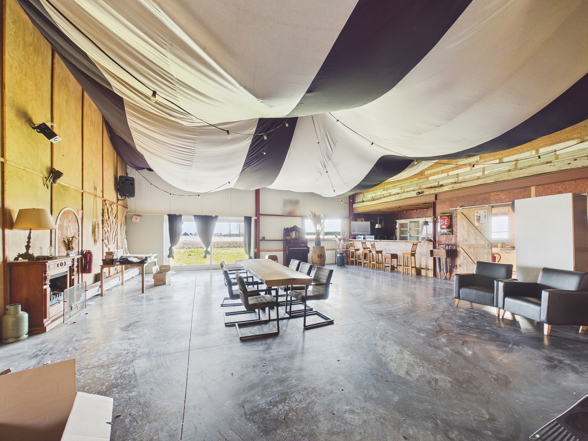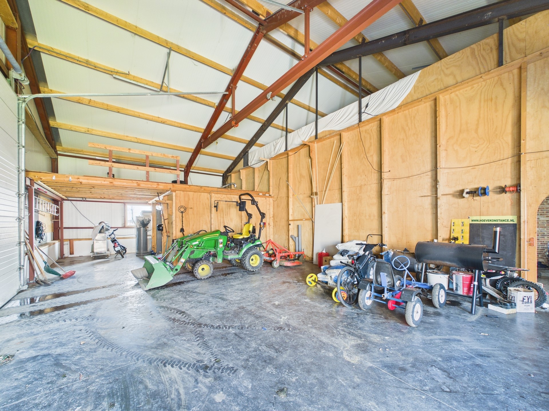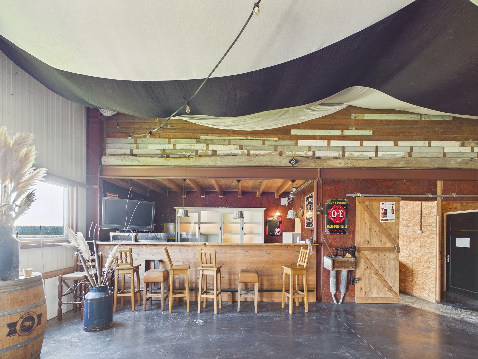 De vrijstaande schuur is praktisch ingedeeld met een werkplaats, een gezellige kantineruimte met bar en keukenblok. Ook bevinden zich hier de sanitaire voorzieningen voor de camperplaatsen ( 1 toilet/doucheruimte). In totaal zijn er 3 paardenboxen aanwezig waarvan er één is ingericht als informatieruimte. Daarnaast is er een ruime bergzolder, ideaal voor extra opslag.